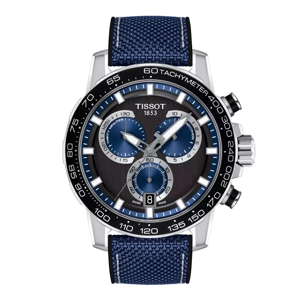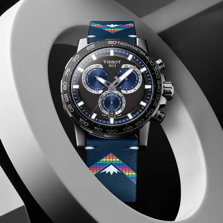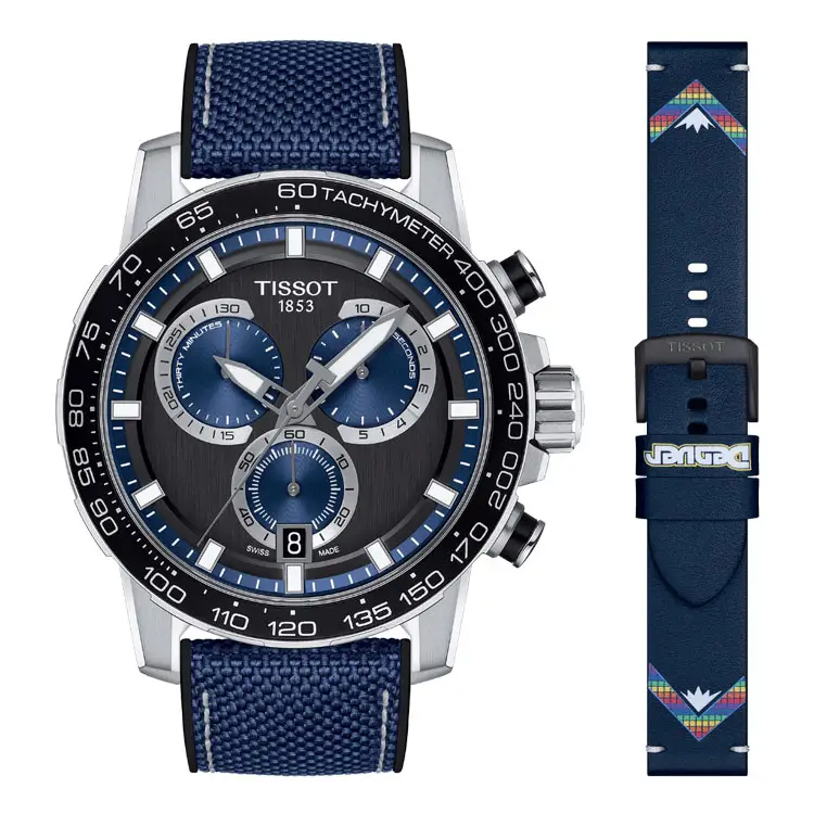 Tissot Supersport Chrono Denver Nuggets 2023 NBA Champions — это лимитированная спортивная модель, посвящённая исторической победе команды Denver Nuggets в NBA. Часы оснащены крупным корпусом из нержавеющей стали диаметром 45,5 мм, чёрным циферблатом с контрастными субциферблатами и синим текстильным ремешком с резиновой подкладкой в командных цветах. На задней крышке выгравированы логотип Denver Nuggets и надпись «2023 NBA Champions».