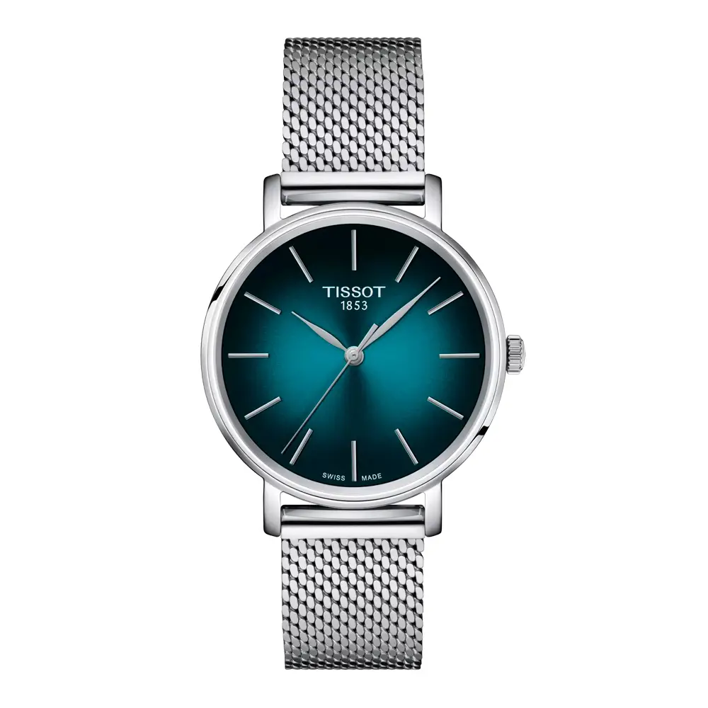 Модель Tissot Everytime 34mm T143.210.11.091.00 сочетает современную элегантность и минималистичный дизайн. Корпус из нержавеющей стали 316L диаметром 34 мм дополнен зеленым циферблатом с плавным переходом в черный, создающим эффект глубины и изысканности.