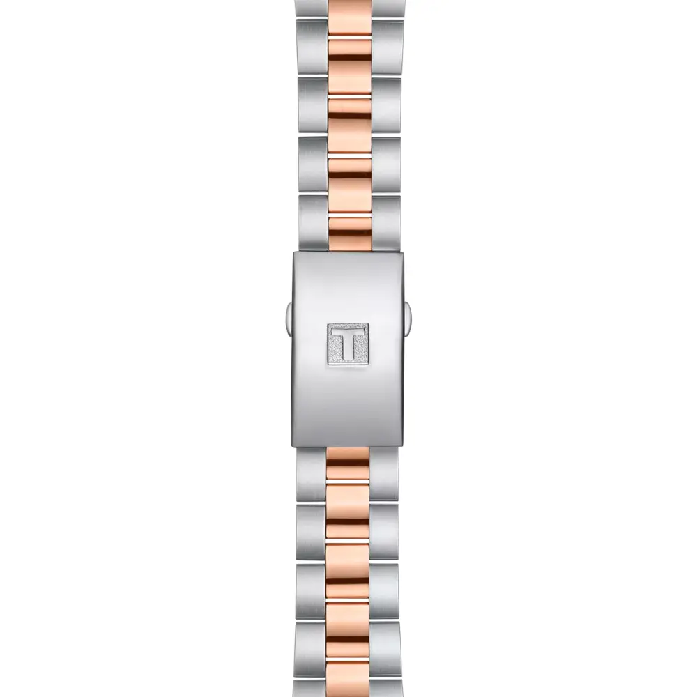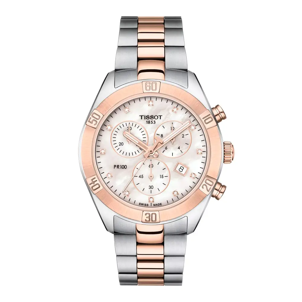 Модель Tissot PR 100 Sport Chic Chronograph T101.917.22.116.00 объединяет спортивную элегантность, роскошные детали и швейцарскую точность. Корпус из нержавеющей стали 316L диаметром 38 мм с розово-золотым PVD-покрытием дополнен перламутровым циферблатом с 12 бриллиантами, придающими часам изысканный женственный шарм.