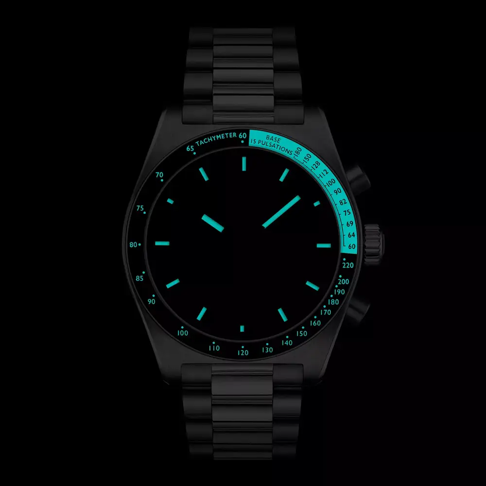 Корпус 40 мм из нержавеющей стали 316L оснащён сапфировым стеклом с антибликовым покрытием, устойчивым к царапинам. Модель имеет тахиметрическую шкалу для измерения скорости и водозащиту 100 м (10 ATM), что подходит для плавания и ежедневного использования. Стальной браслет с раскладной застёжкой обеспечивает надёжное и удобное ношение.