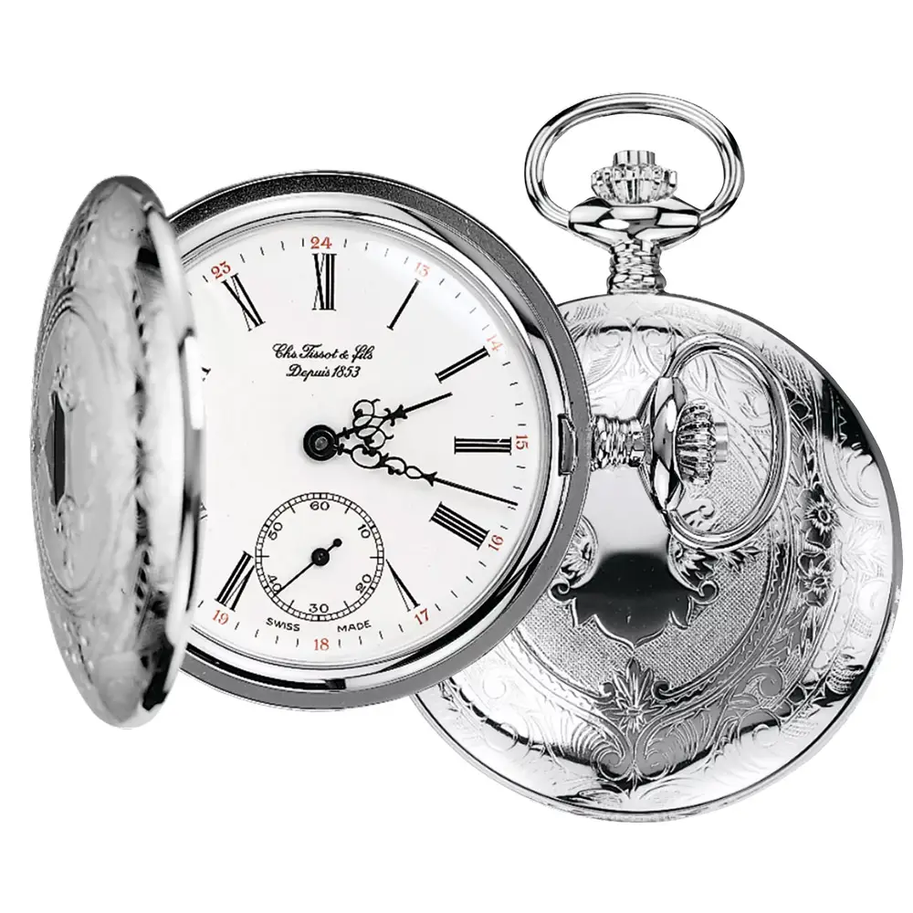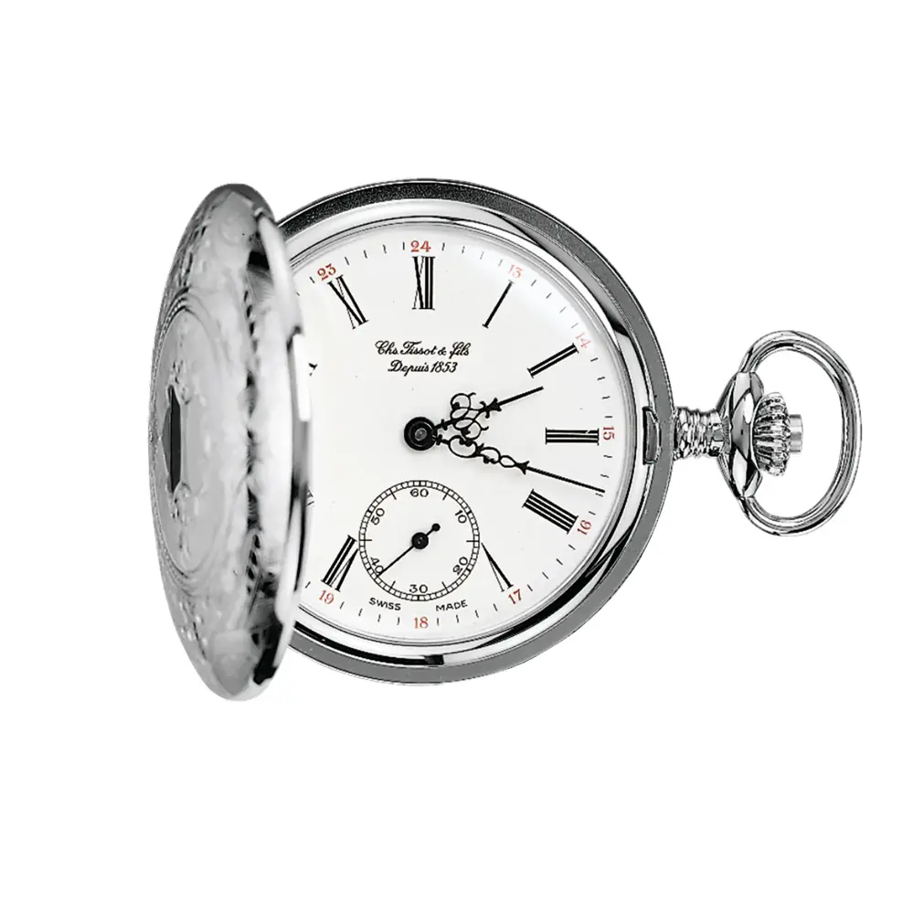 Модель Tissot Savonnette T83.6.401.13 продолжает традиции классических карманных часов, предлагая чистую и элегантную эстетику швейцарского мастерства. Корпус из нержавеющей стали 316L с палладиевым покрытием и диаметр 49,6 мм придают часам выразительный и благородный облик. Белый циферблат с римскими цифрами подчёркивает их timeless-характер и историческую стилистику.