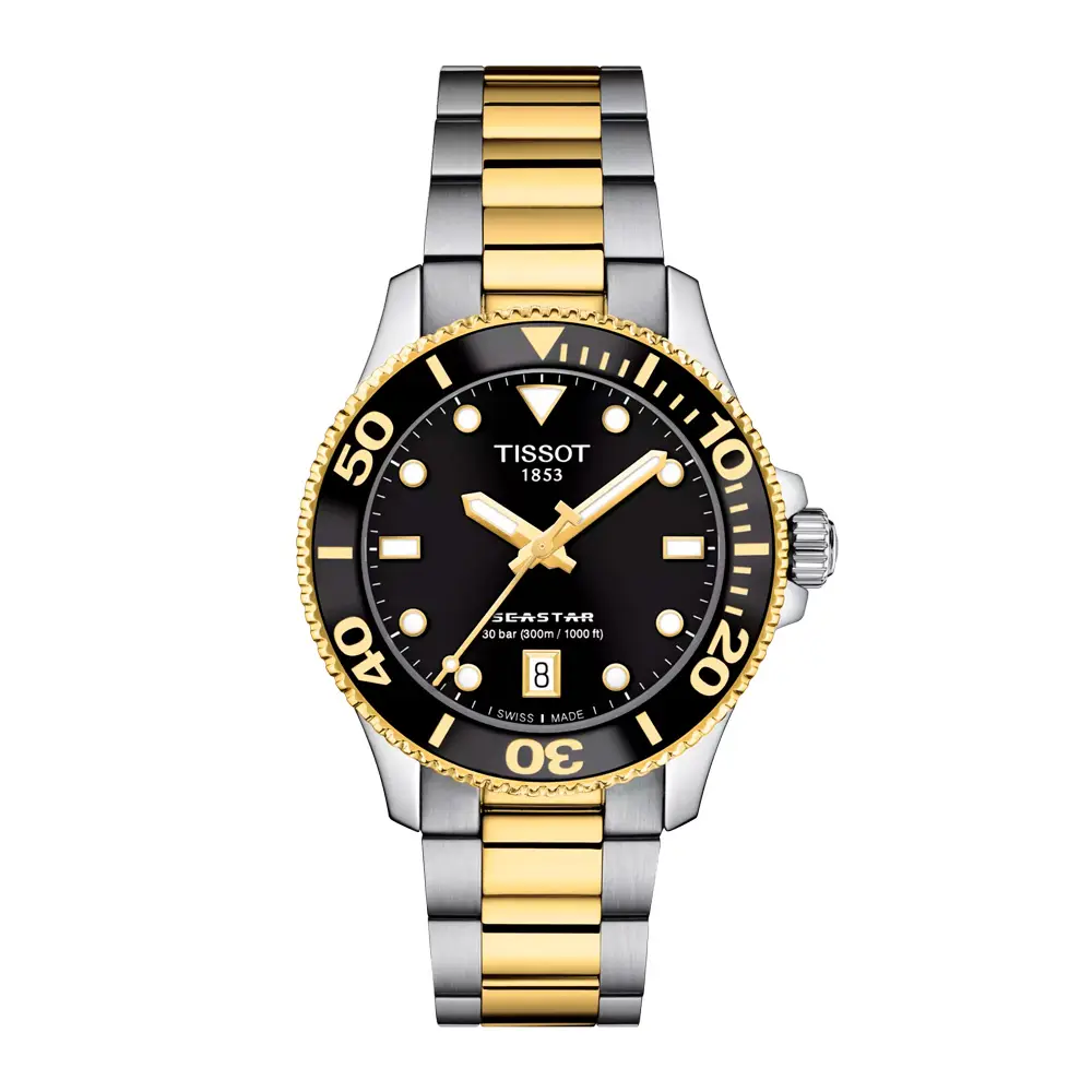 Модель Tissot Seastar 1000 36mm T120.210.22.051.00 сочетает в себе профессиональные дайверские характеристики, швейцарскую точность и изящный стиль в компактном размере. Корпус из нержавеющей стали 316L диаметром 36 мм с двухцветным PVD-покрытием под жёлтое золото дополнен чёрным циферблатом с люминесцентными стрелками и метками, обеспечивающими отличную читаемость под водой.
