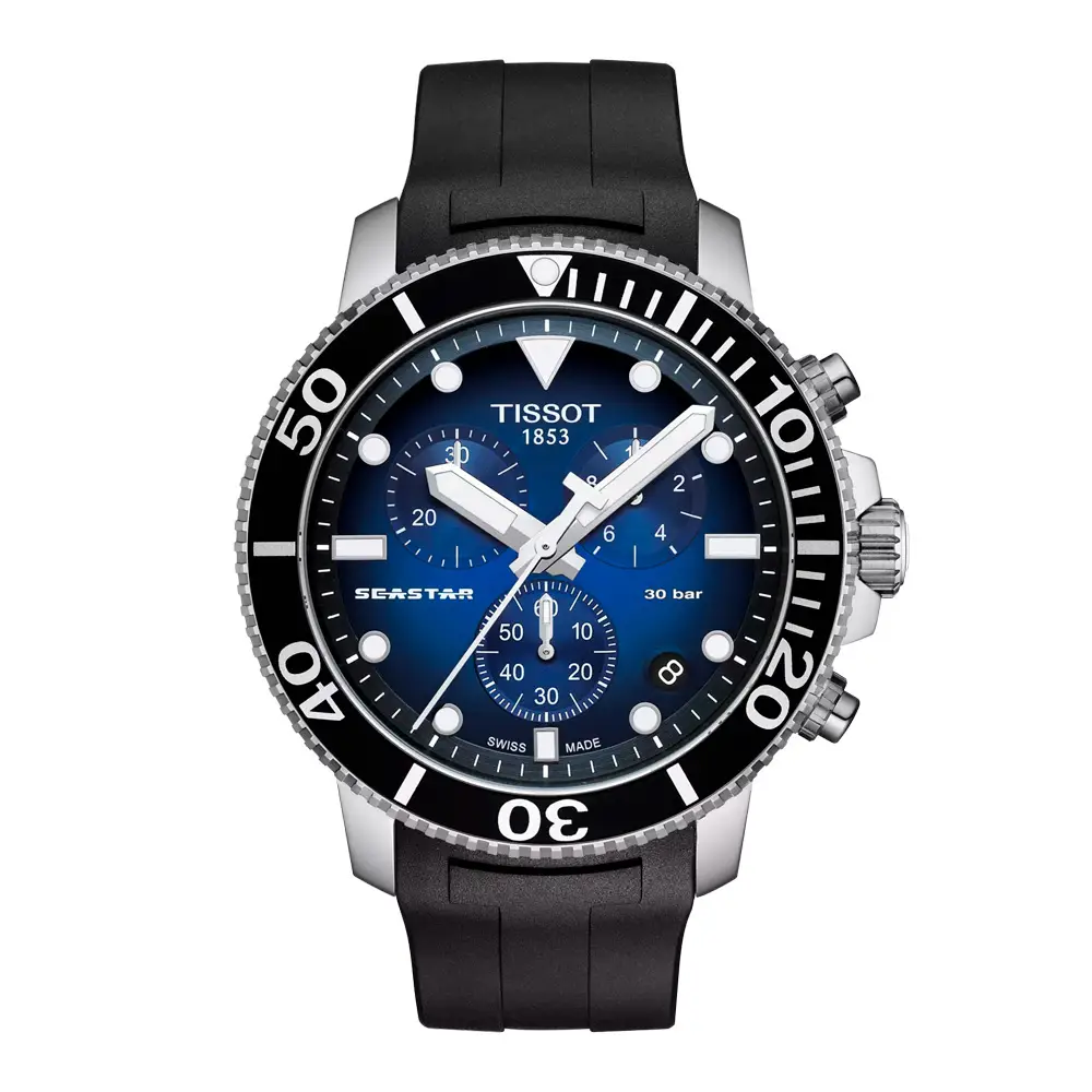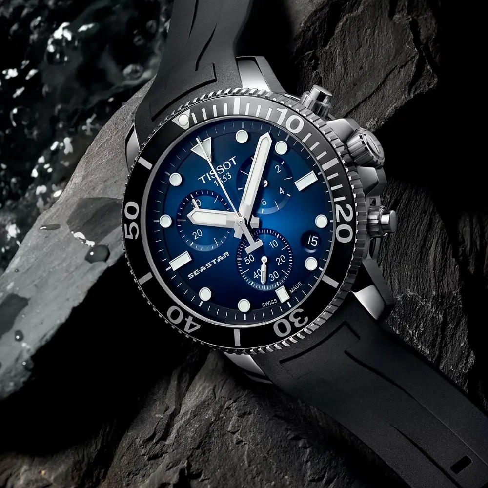 Синий каучуковый ремешок обеспечивает комфорт и спортивный вид. Tissot Seastar 1000 Quartz T120.417.17.041.00 — идеальный выбор для мужчин, ценящих мощные, стильные и универсальные часы, сочетающие швейцарское качество, техническое совершенство и спортивную элегантность.