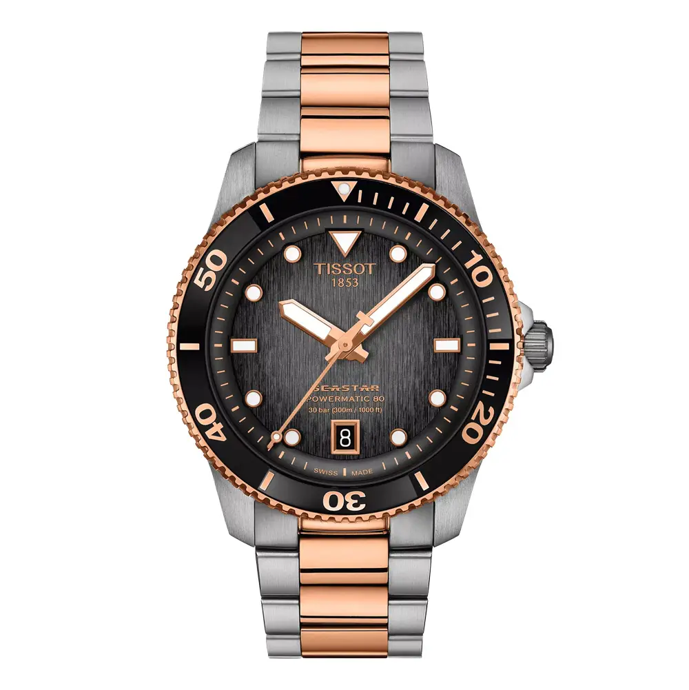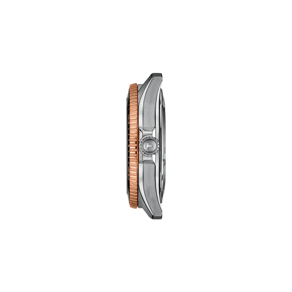Модель Tissot Seastar 1000 Powermatic 80 (T120.807.22.051.01) сочетает в себе спортивную прочность и современную элегантность. Корпус из стали 316L диаметром 40 мм с двухцветным PVD-покрытием в стальном и розово-золотистом оттенках придаёт часам выразительный и в то же время классический стиль. Циферблат серого цвета защищён сапфировым стеклом с антибликовым покрытием, обеспечивающим высокую стойкость к царапинам.