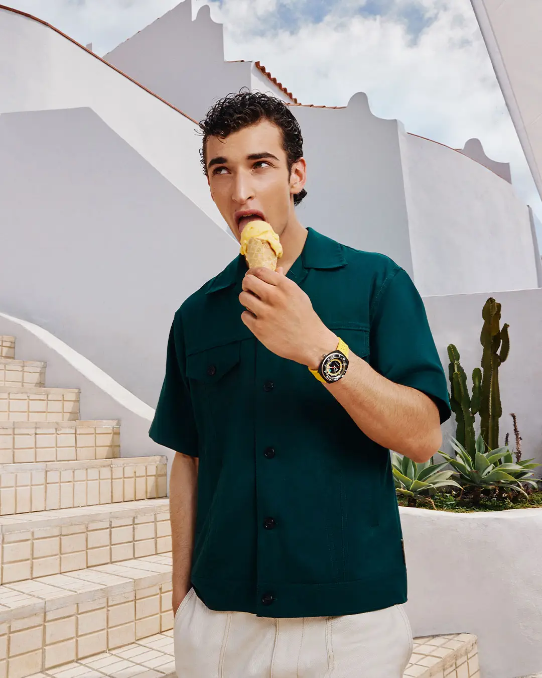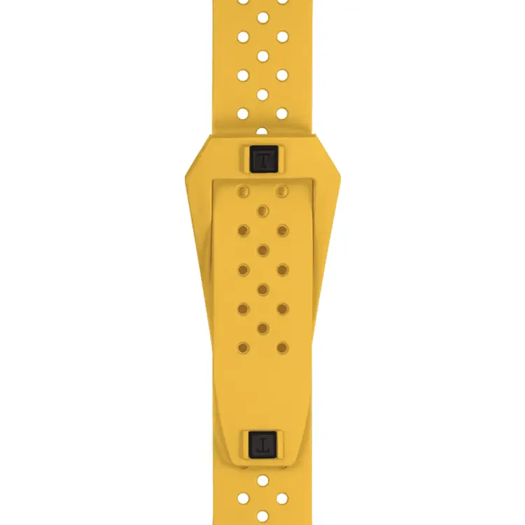 Часы водонепроницаемы до 300 метров (30 бар), что идеально подходит для любителей водных видов спорта. Уникальный перфорированный резиновый ремешок ярко-желтого цвета добавляет часам привлекательности и комфорта при ношении. Кроме того, часы имеют инновационную систему застежки без традиционной пряжки, что обеспечивает надежное и удобное крепление на запястье.