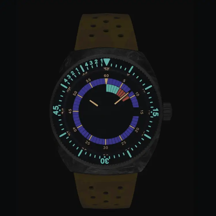 Корпус часов изготовлен из легкого кованого карбона и имеет характерную форму 'тоннеля' (бочки). На черном циферблате выделяются яркие желтые минутные метки, зеленые и красные акценты, а также люминесцентные стрелки, покрытые Super-LumiNova® для лучшей читаемости в темноте. Сапфировое стекло имеет антибликовое покрытие и устойчиво к царапинам, что гарантирует долгий срок службы часов.