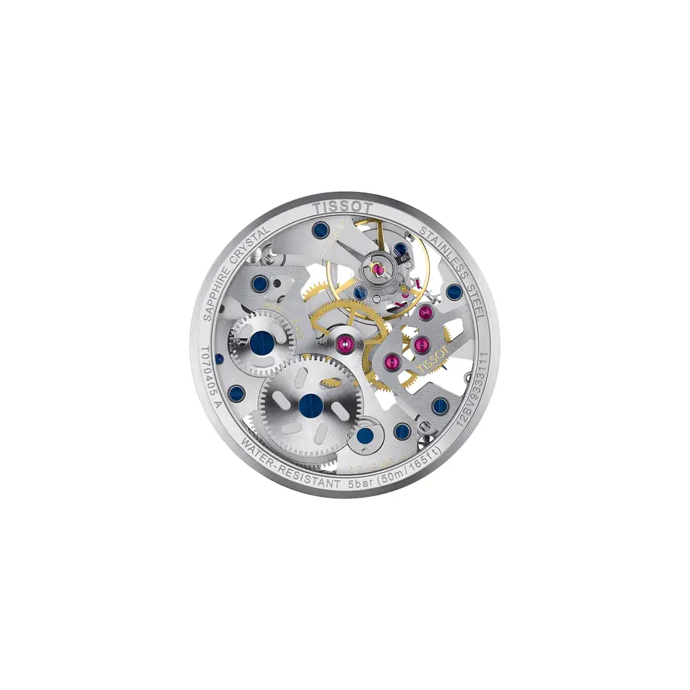 Tissot T-Complication Squelette T070.405.16.411.00 сочетает традиционное швейцарское часовое мастерство с современным техническим дизайном. Основная особенность модели — скелетонизированный циферблат, открывающий вид на тщательно созданный механический калибр ETA 6497-1 с ручным заводом, 17 камнями, частотой 18 000 полуколебаний в час и запасом хода около 46 часов. Прозрачная задняя крышка позволяет наблюдать работу механизма с обеих сторон, превращая часы в настоящее произведение искусства.