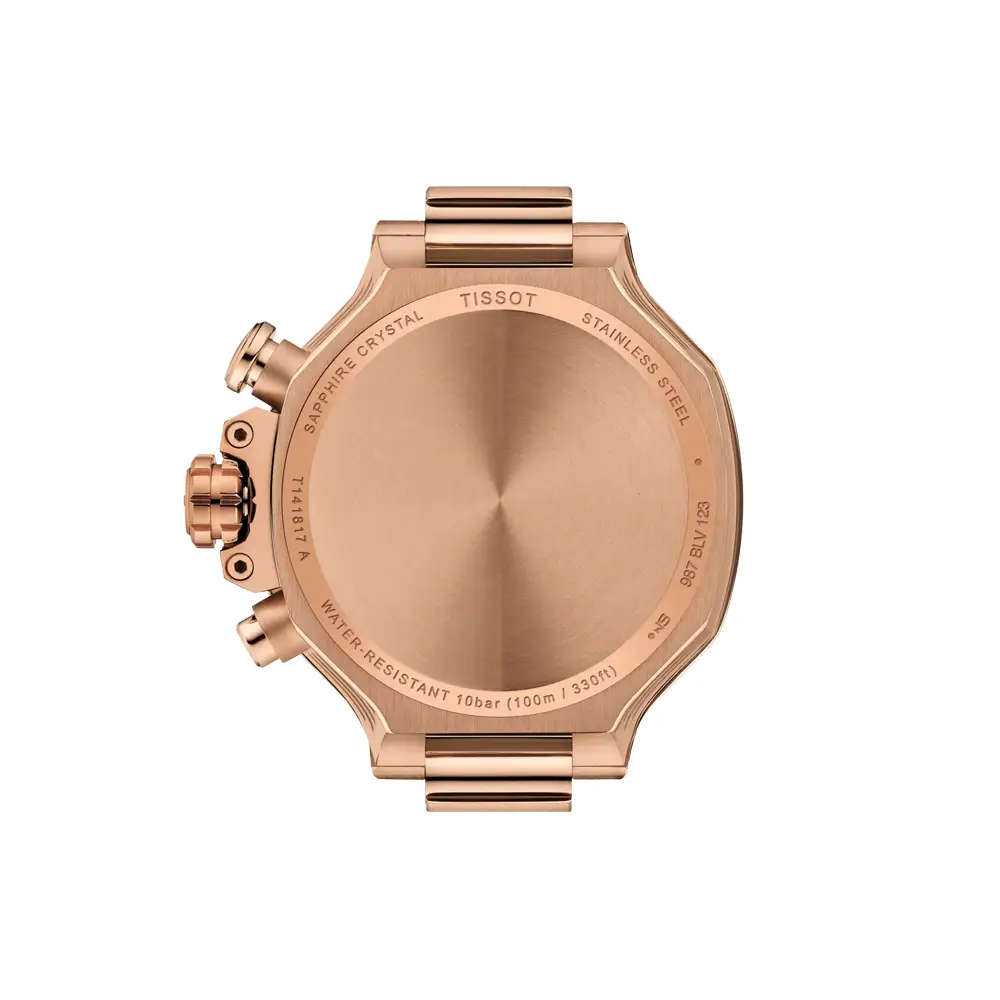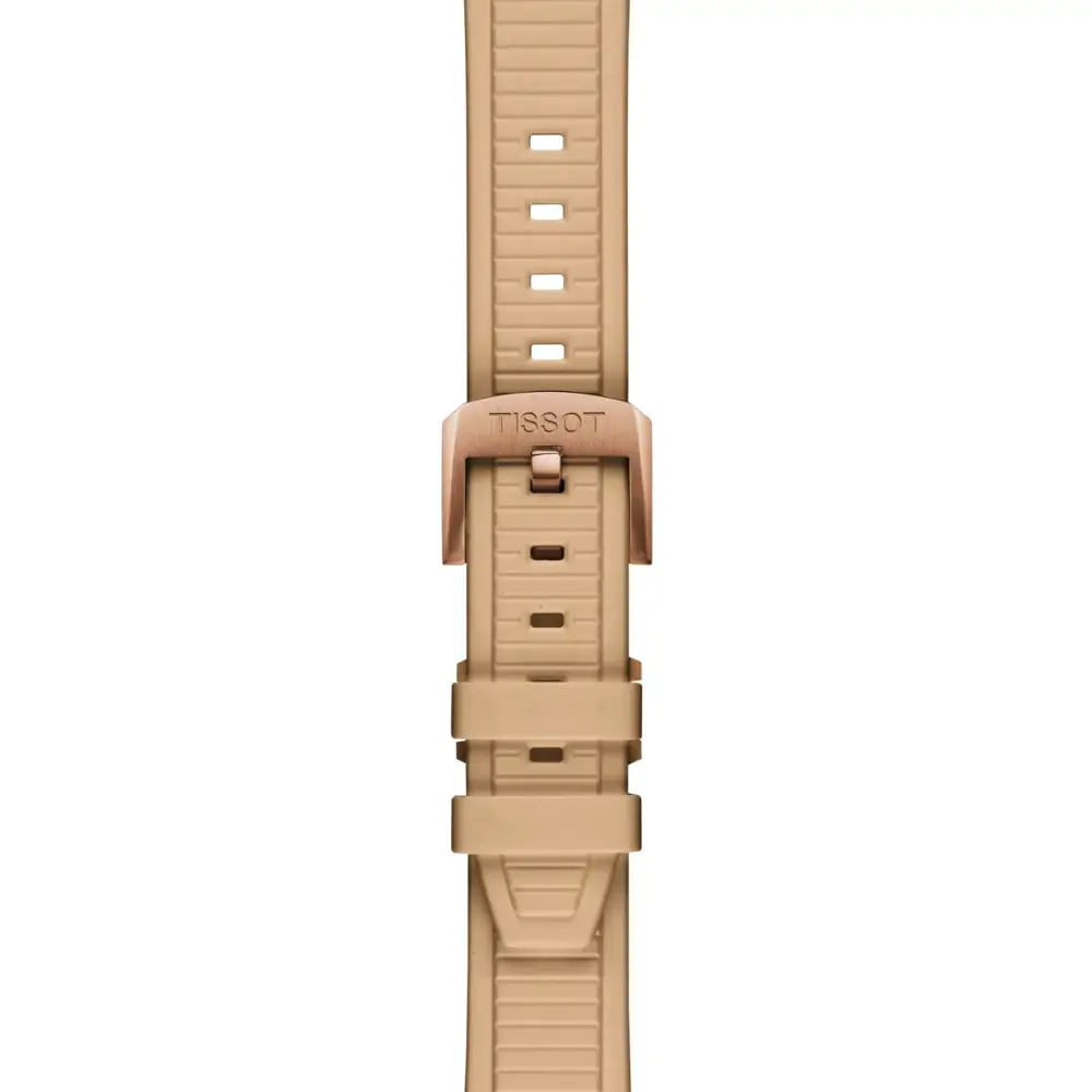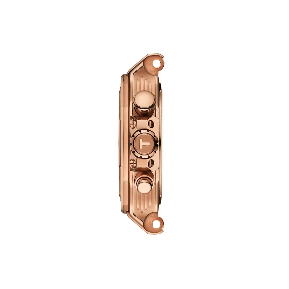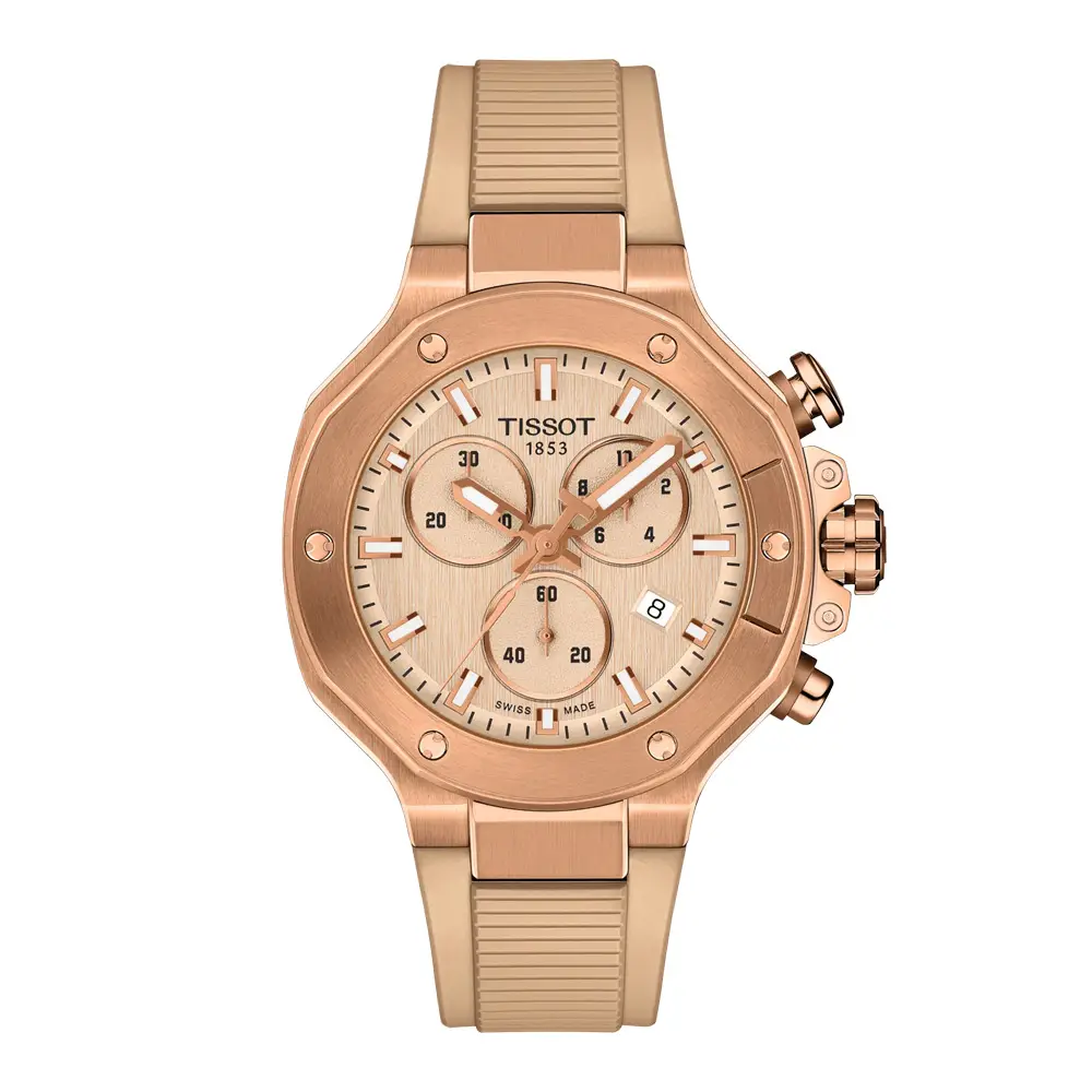 Модель T-Race сочетает дизайн, вдохновлённый мотоспортом, с компактным диаметром 38 мм, что делает её идеальной для повседневного ношения. Корпус из нержавеющей стали 316L с розово-золотым PVD-покрытием подчёркивает элегантность, а силиконовый ремешок и светлый циферблат добавляют спортивной динамики. Форма безеля и кнопок хронографа отсылает к гоночной технике, создавая выразительный характер.
