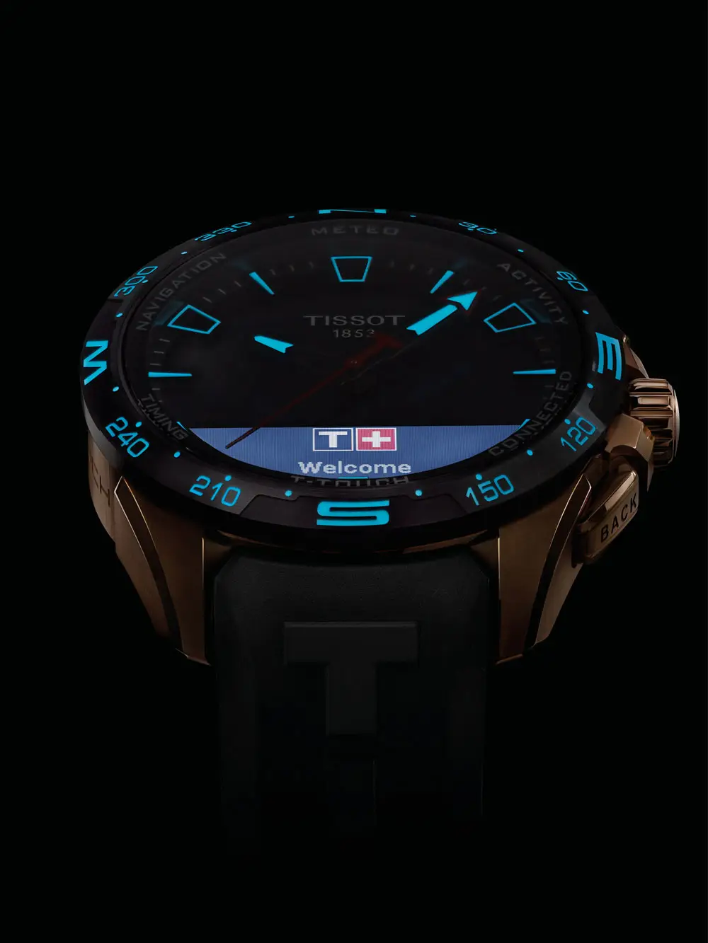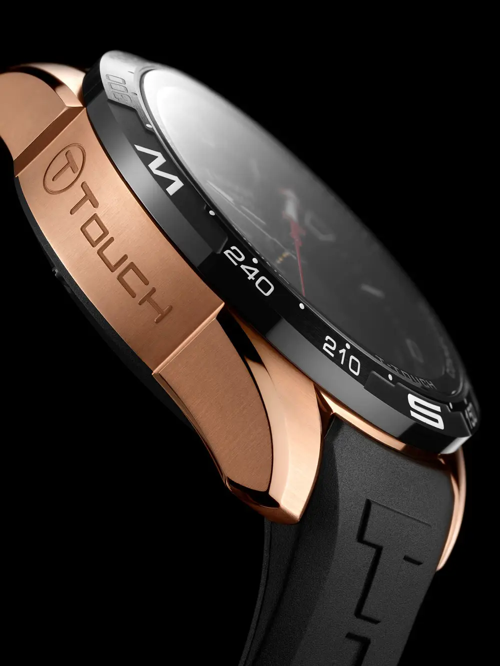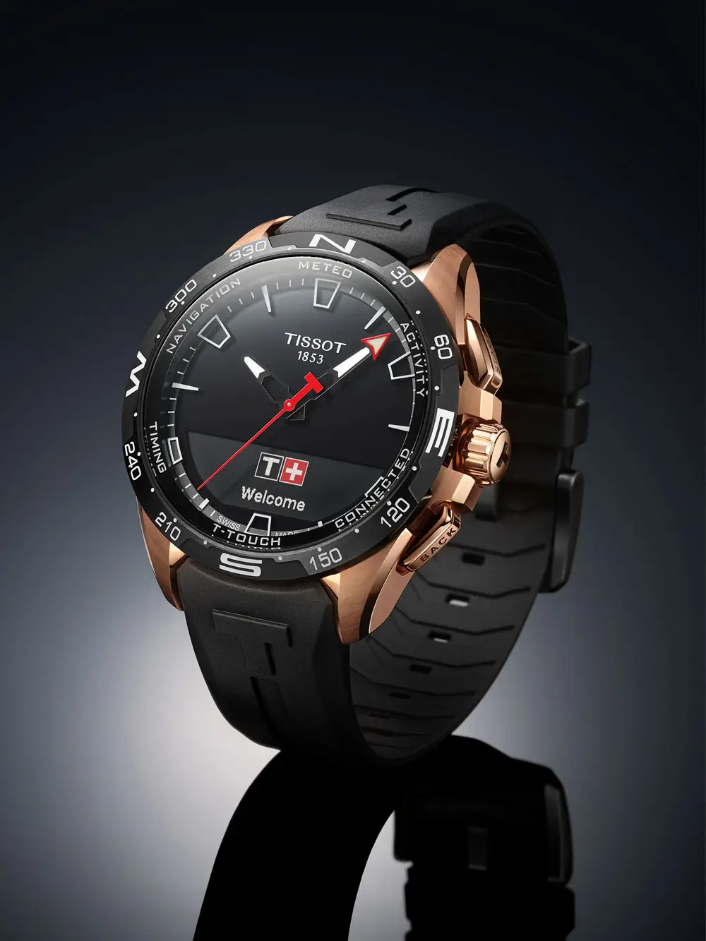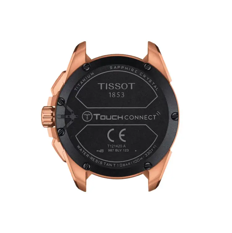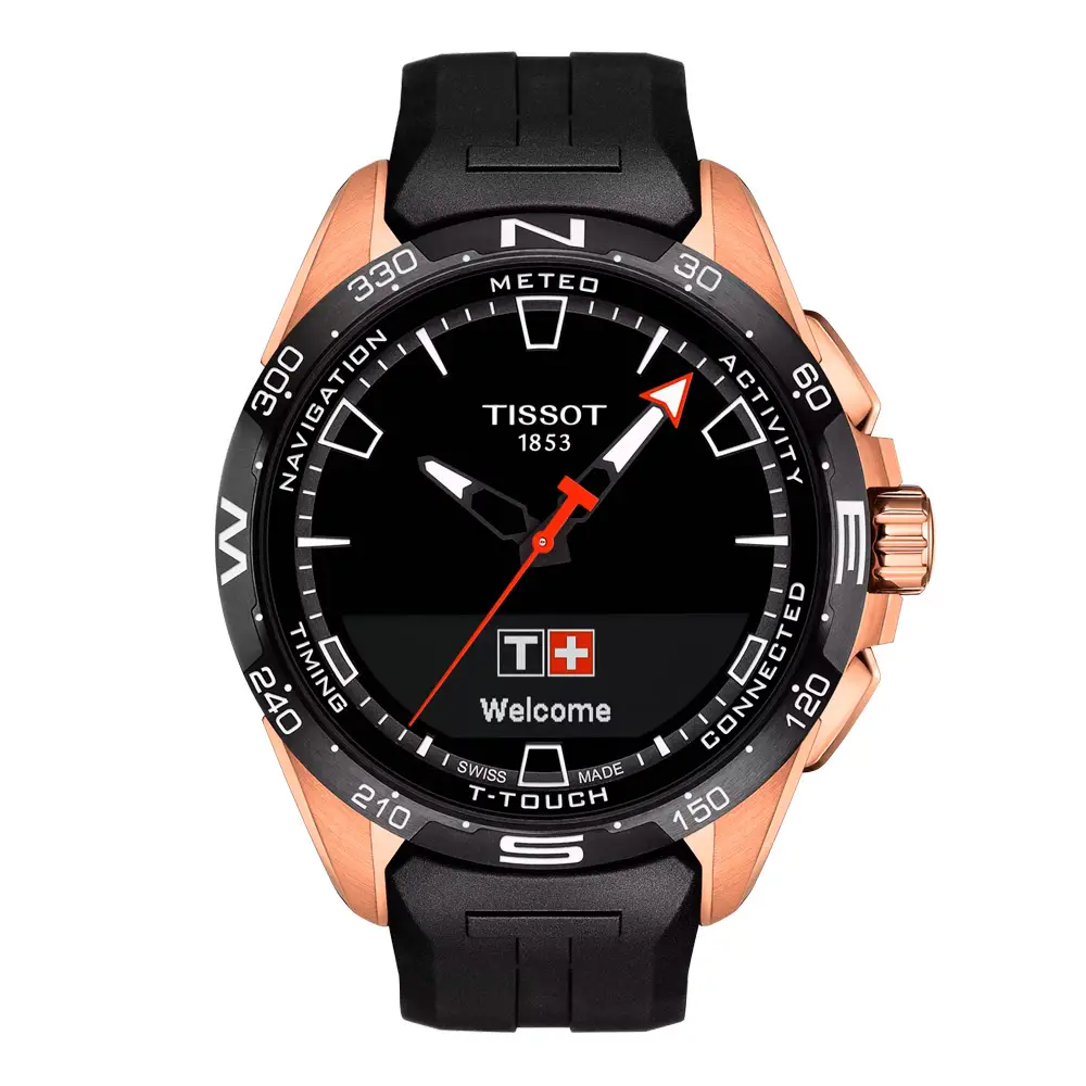 Tissot T-Touch Connect Solar — это воплощение современных технологий, солнечной энергии и спортивного швейцарского дизайна. Эти часы сочетают в себе традиционное часовое мастерство и функции смарт-устройств, занимая место между классическими и умными часами. Корпус из титана с розовым PVD-покрытием и керамический безель дополняют гибридный аналогово-цифровой циферблат, защищённый сапфировым стеклом, устойчивым к царапинам.