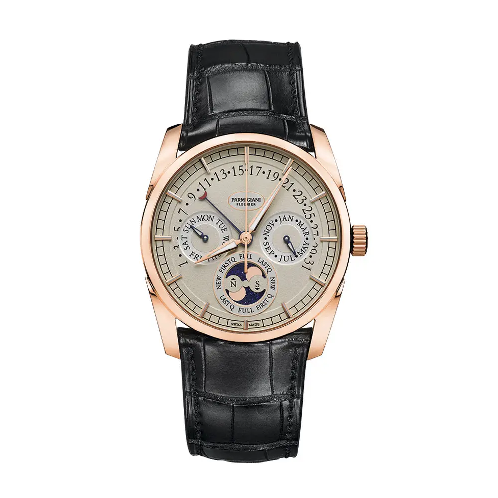 Модель Parmigiani Fleurier Tonda Calendrier Annuel, референс PFC272-1002401-HA1242, является шедевром швейцарского высокого часового искусства, объединяя классическую элегантность, передовую механику и выдающееся часовое мастерство. Этот 40-миллиметровый корпус выполнен из 18-каратного розового золота, что придаёт часам тёплый, роскошный вид, подчеркнутый коричневым кожаным ремешком из аллигатора Hermès ручной работы.
