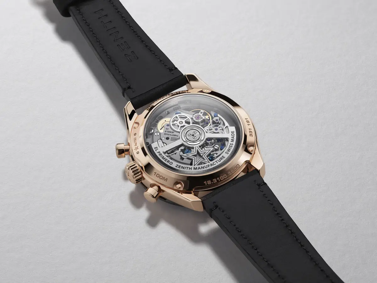 Внутри находится легендарный механизм El Primero с автоподзаводом, работающий с частотой 36 000 колебаний в час (5 Гц). Он позволяет измерять время с точностью до десятой секунды и обеспечивает резерв хода до 60 часов.