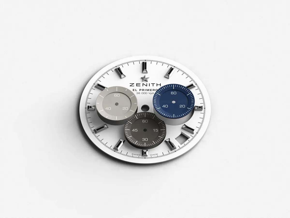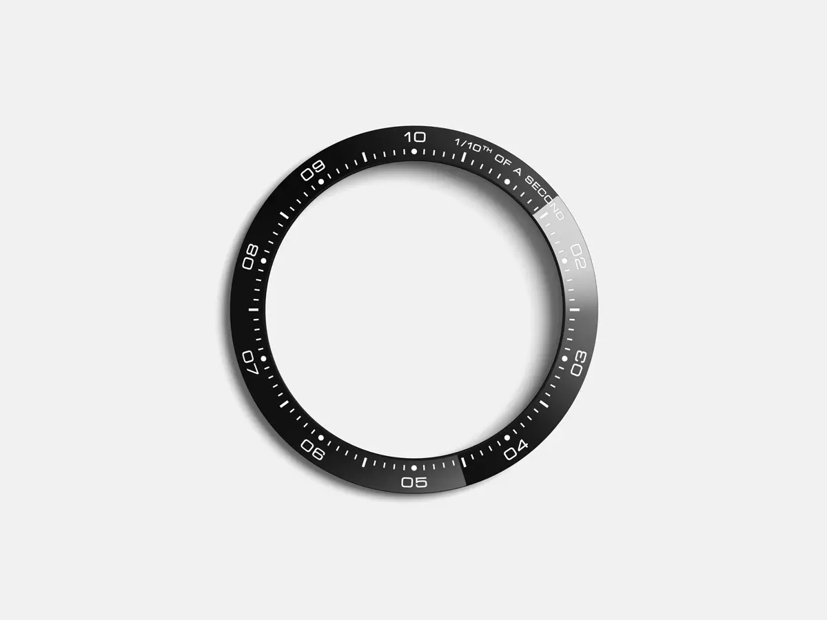 Белый аналоговый циферблат включает три дополнительных индикатора, классические стрелки, функцию хронографа и индикатор даты, органично встроенные в дизайн. Чёрный керамический безель с тахиметрической шкалой подчёркивает спортивный характер и устойчив к повреждениям.