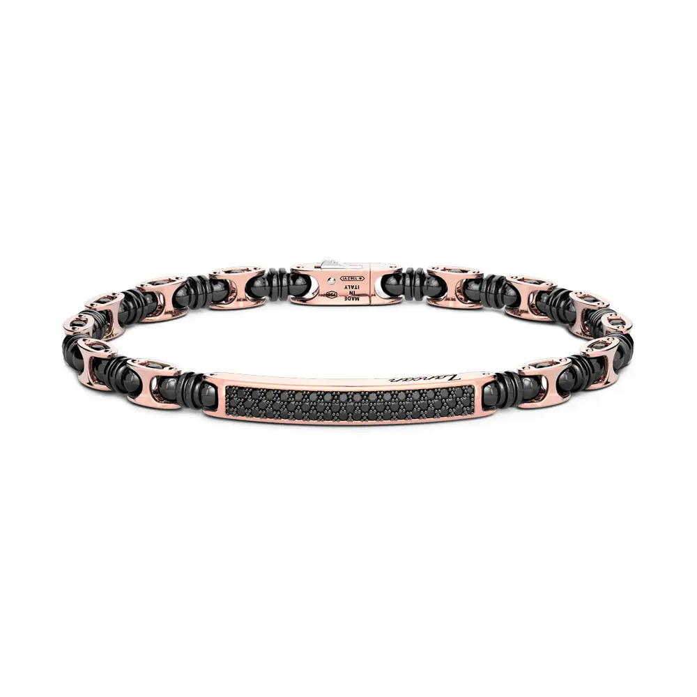 Ключевым элементом дизайна являются чёрные бриллианты общим весом 2,30 ct, создающие эффектный контраст с золотом и вставками из чёрной керамики. Такое сочетание драгоценных материалов и современных технологий придаёт украшению уверенный, роскошный характер. Браслет выглядит выразительно и элегантно одновременно, что делает его универсальным аксессуаром.