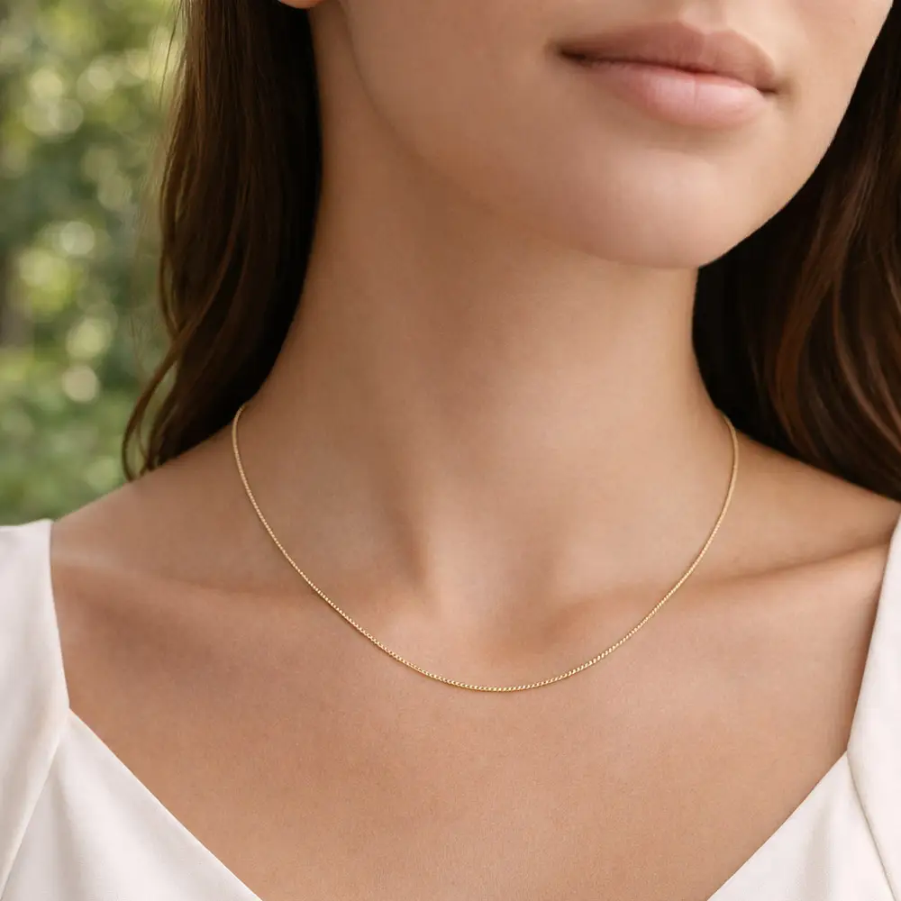 Длина 45 см обеспечивает комфортную посадку и подчёркивает линию декольте, а ширина 1,3 мм придаёт украшению изящный, но более выразительный характер. Цепочка подходит для повседневной носки и особых случаев, легко сочетается с другими золотыми украшениями и является универсальным аксессуаром с долговечной ценностью.
