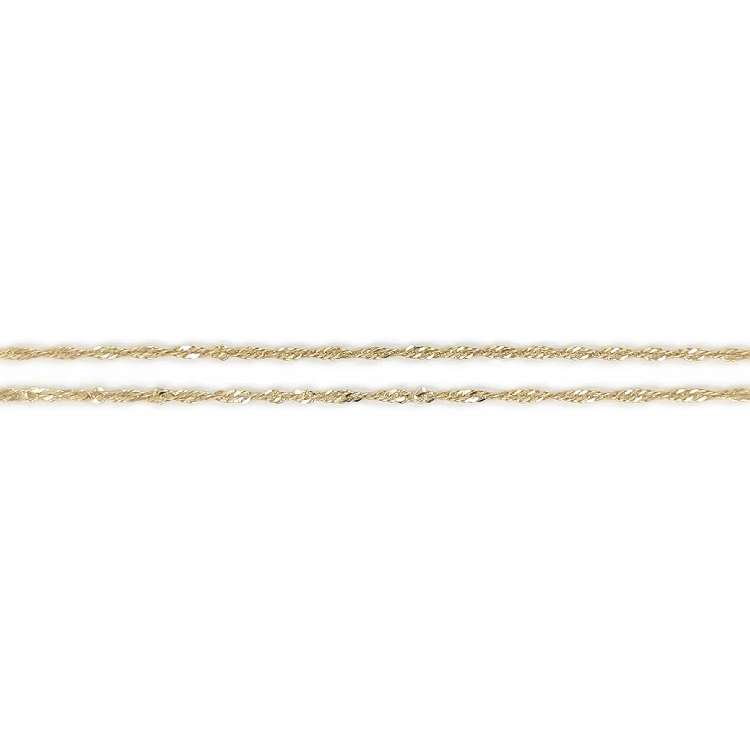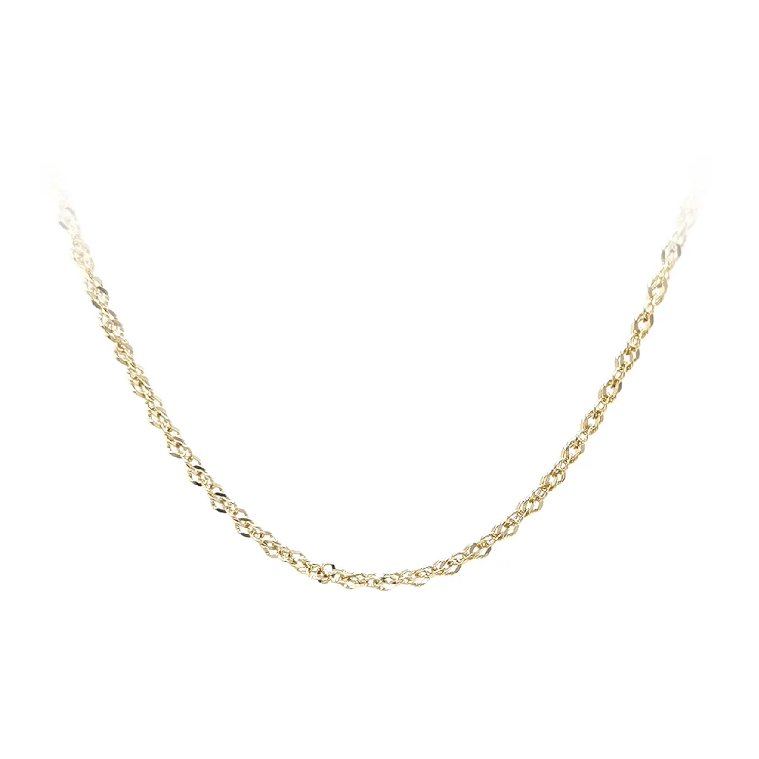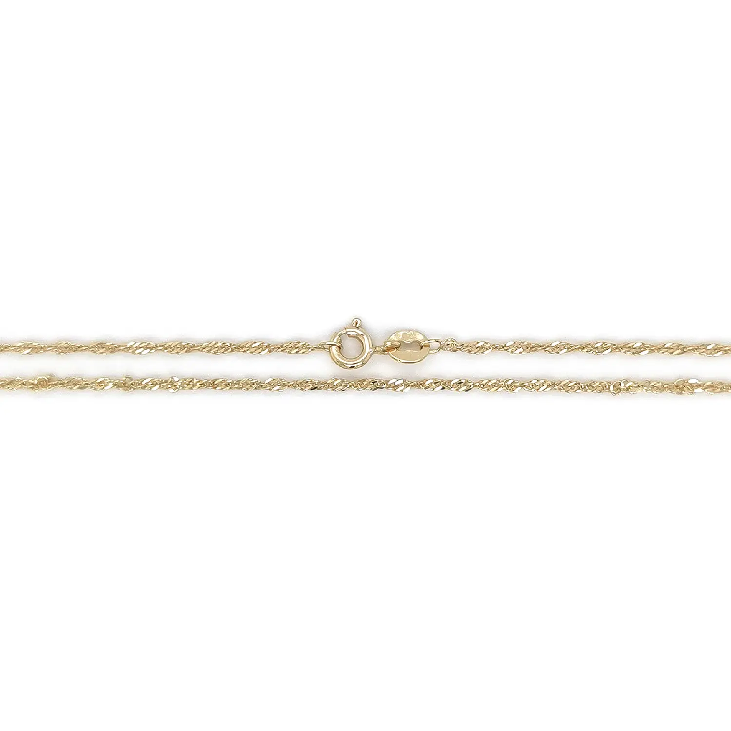 Золотая цепочка плетения «Сингапур» привлекает внимание своей изящной витой структурой, которая красиво отражает свет и придаёт украшению живое, элегантное сияние. Тонко выполненные звенья выглядят лёгкими и утончёнными, а ширина 1,60 мм обеспечивает гармоничный баланс между выразительностью и повседневной элегантностью.