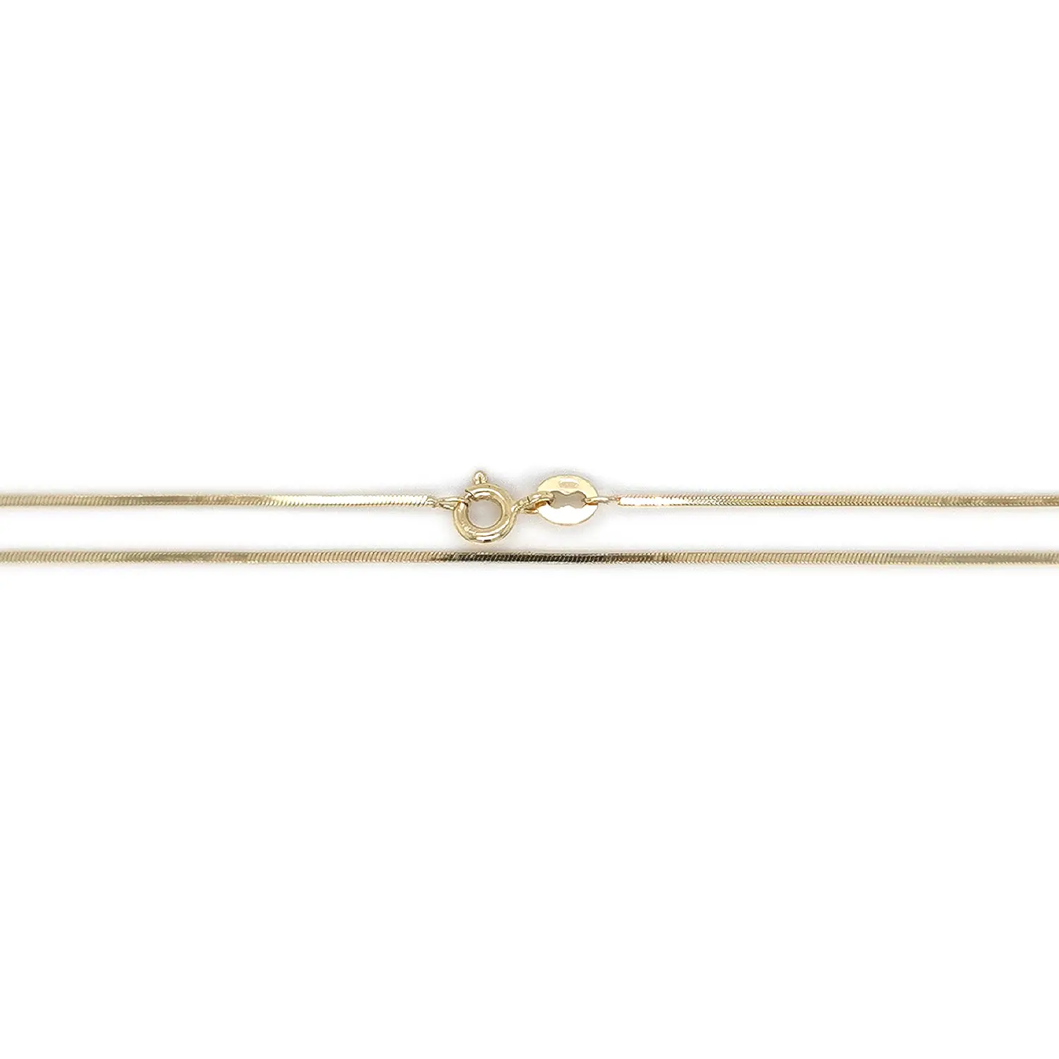 Цепочка изготовлена из золота, имеет длину 45 см и ширину 0,80 мм. Плетение «змейка» обеспечивает высокую гибкость и комфорт при ношении, а пружинный замок гарантирует надежную фиксацию.