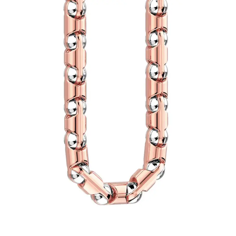 Мужская цепь Zancan сочетает современную двухцветную эстетику с точным итальянским исполнением. Изготовлена из золота 18 карат (750/1000) в двухцветном сочетании белого и розового с полированной поверхностью — мужественно и изысканно. Характер подчёркивает толщина от 5 мм: выразительно и мощно визуально, не теряя элегантности.
