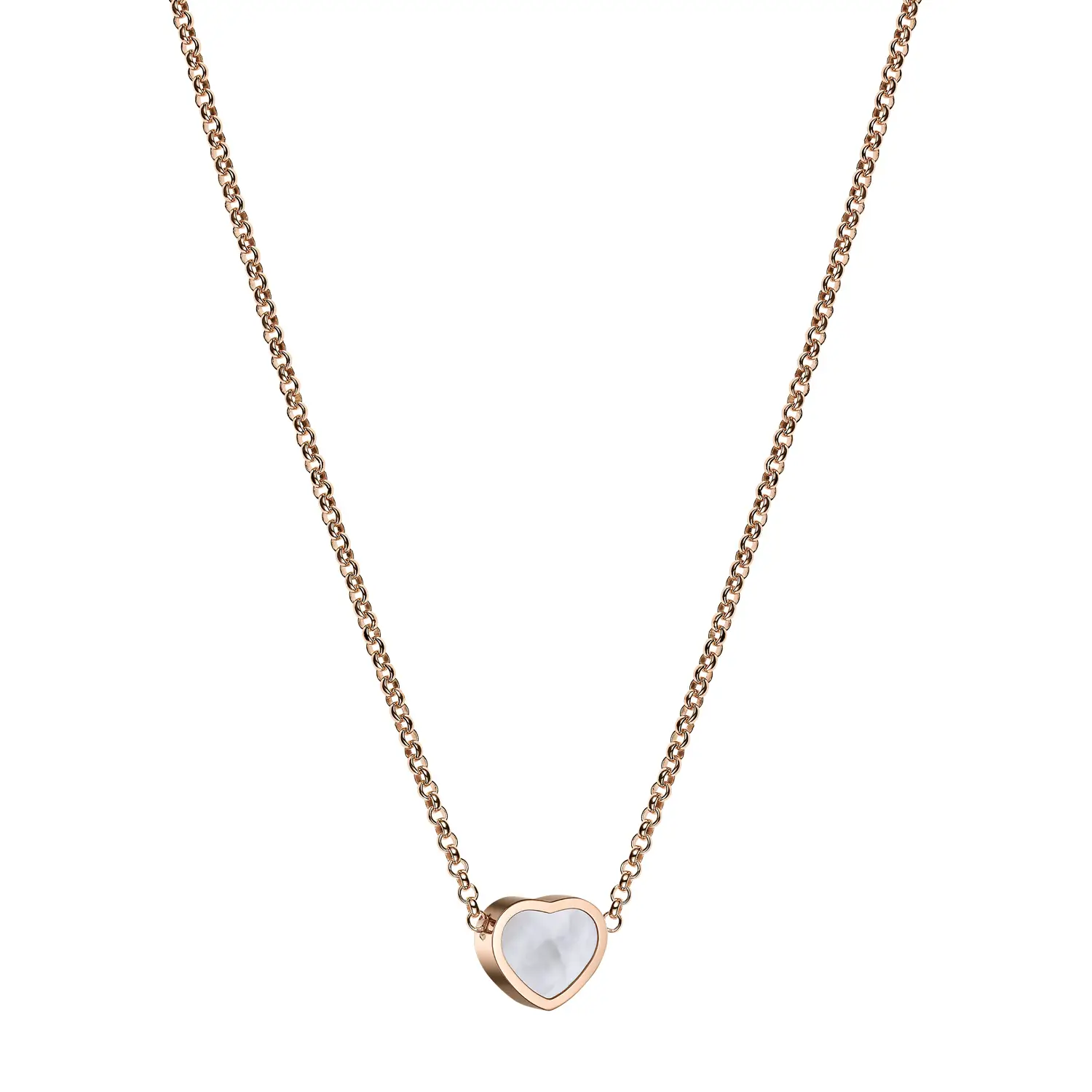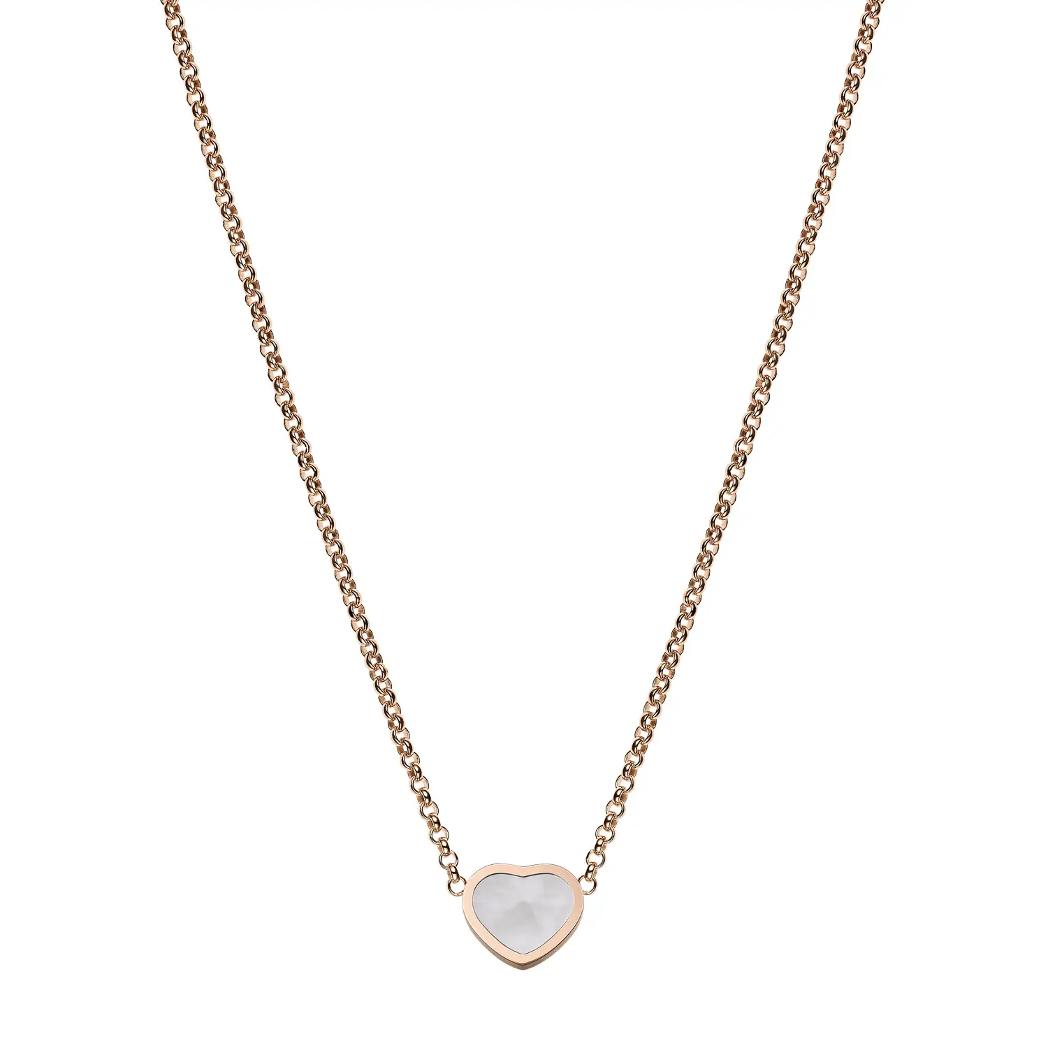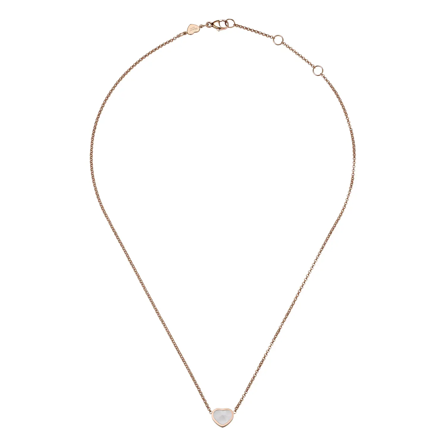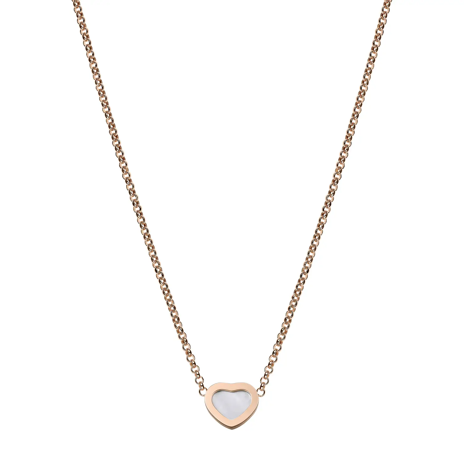 Колье Chopard My Happy Hearts 81A086-5301 олицетворяет нежность, женственность и современную элегантность. Изготовлено из этичного розового золота 18 карат, украшено сердцем из белого перламутра, которое мягко сияет при свете. Минималистичный дизайн символизирует любовь и внутреннюю свободу.