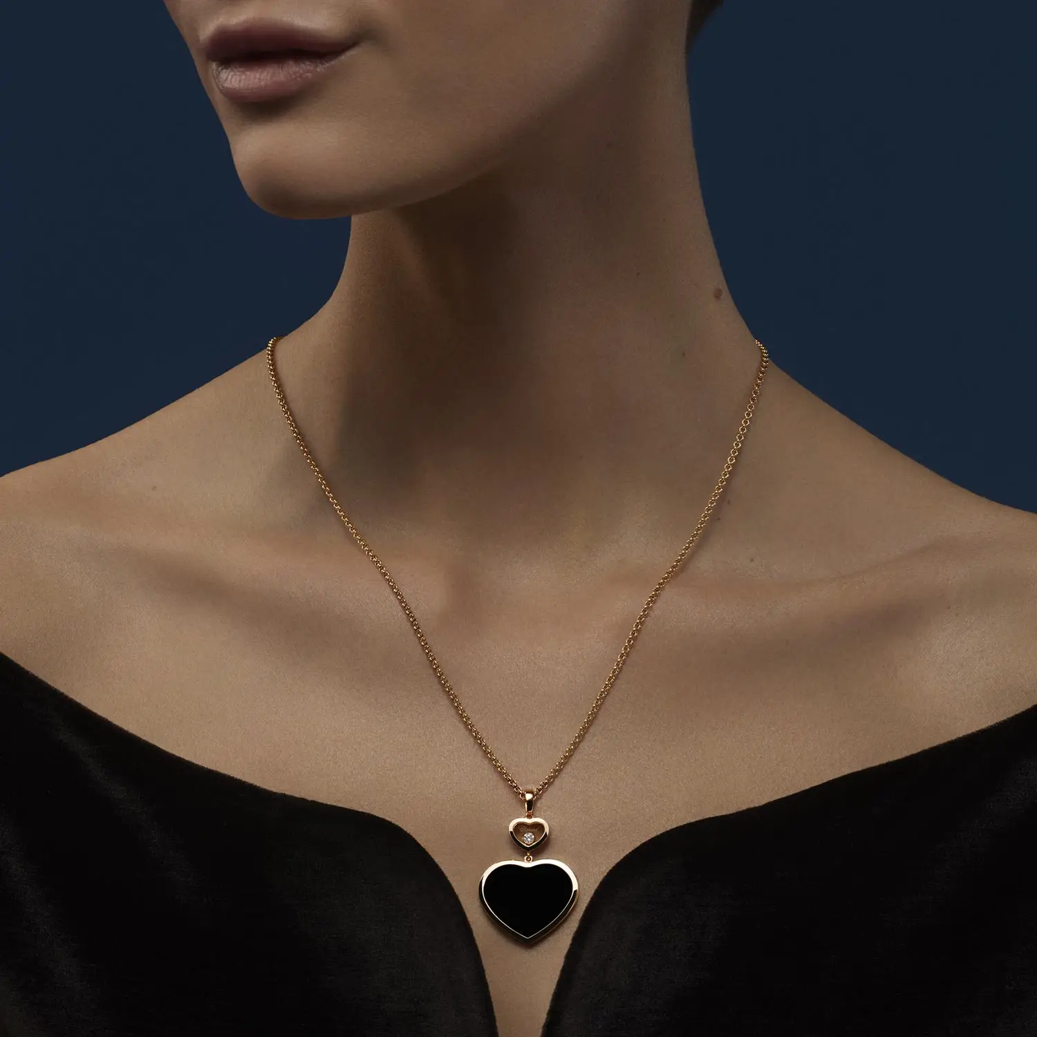 Одну половину украшает выразительный натуральный оникс в форме сердца, насыщенно-чёрный цвет которого элегантно контрастирует с тёплым оттенком розового золота. Вторую сторону дополняет один свободно движущийся бриллиант, заключённый в миниатюрное сердечко. Этот природный круглый бриллиант отличается исключительной чистотой (IF) и цветом F-G, что придаёт ему выдающееся сияние.