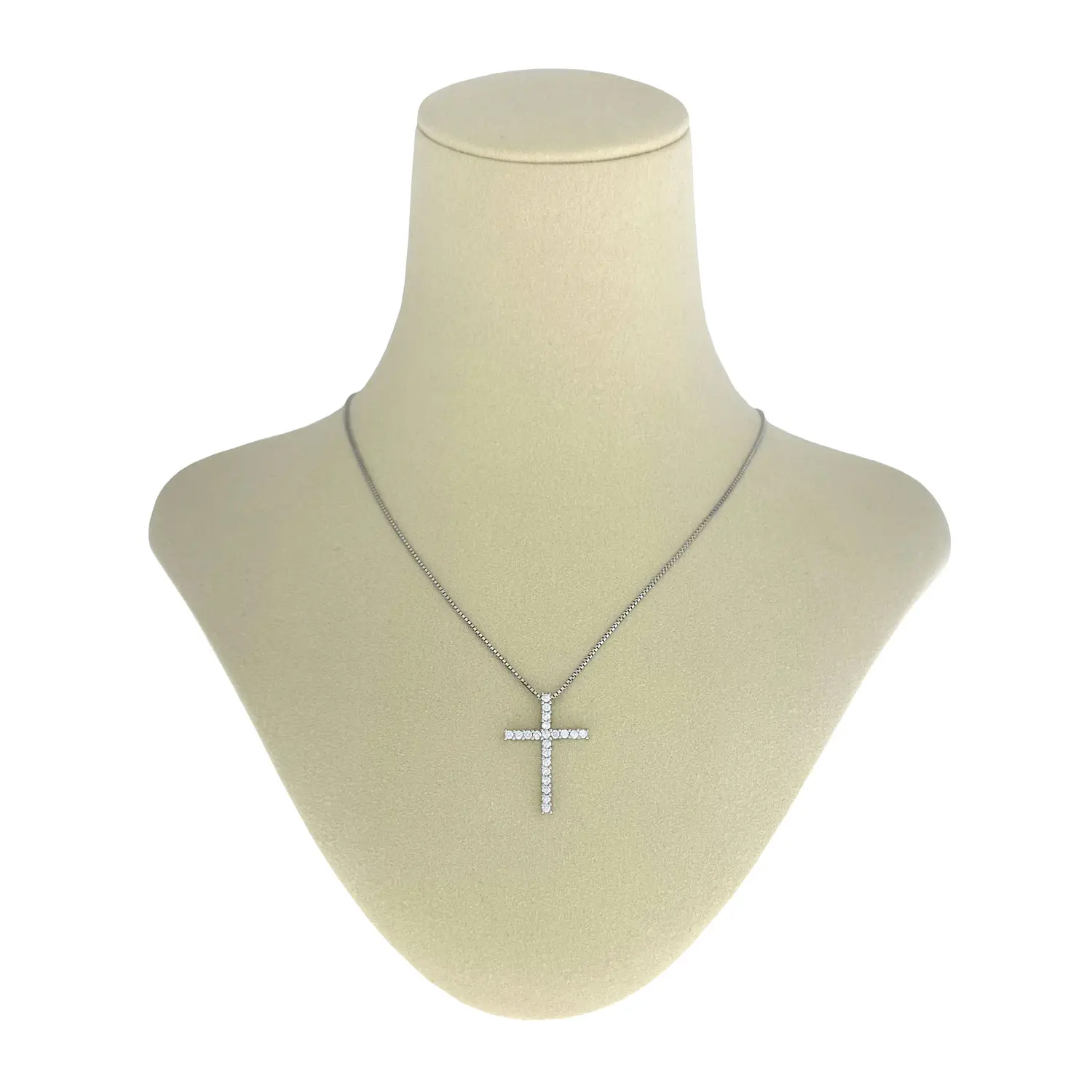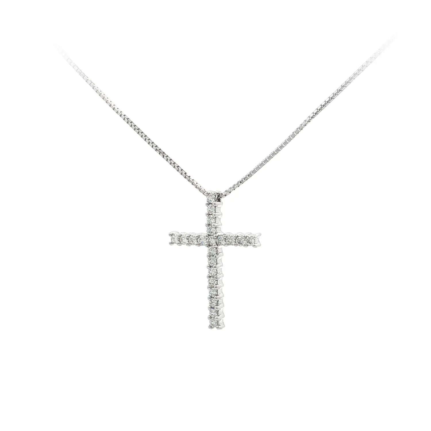 Этот изящный кулон в форме креста из белого золота олицетворяет веру, чистоту и вечную элегантность. Каждый сегмент украшен бриллиантами круглой огранки, которые сияют при каждом движении и подчёркивают утончённость дизайна. Лаконичная форма делает украшение универсальным и стильным выбором для любого случая.