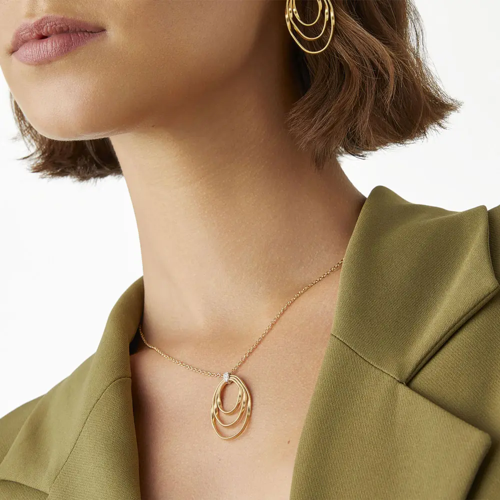 Этот утончённый подвес из коллекции Marrakech Onde от Marco Bicego выполнен из золота 18 карат (750/1000) и украшен фирменной матовой отделкой, подчёркивающей его плавные линии и ручную работу мастеров. Пропорции изделия — 19,35 мм ширина, 2,60 мм высота, 37,35 мм длина вместе с ушком — в сочетании с цепочкой длиной 45 см создают изысканный силуэт на шее.