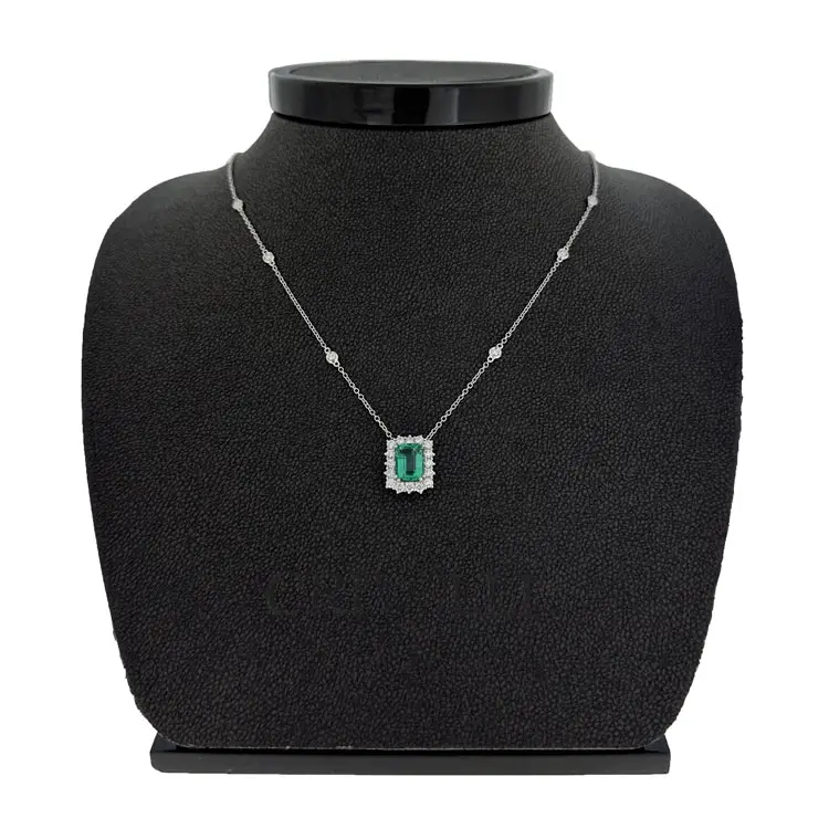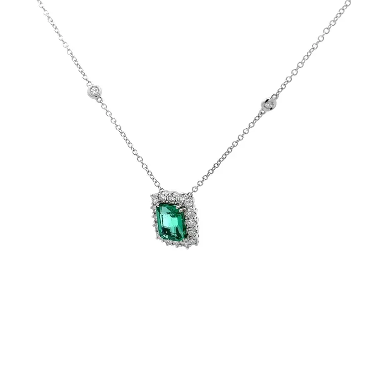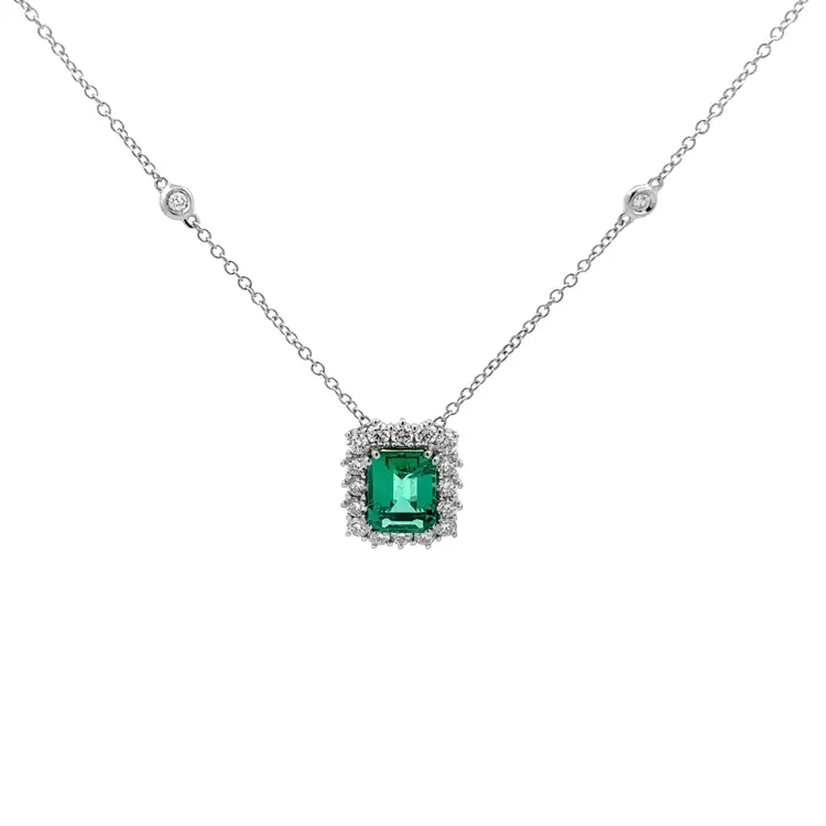 Подвеска Beny Jewellery из белого золота со смарагдом и бриллиантами — это воплощение роскоши и утончённого вкуса. Классический стиль halo подчеркивает насыщенный зелёный оттенок природного смарагда, обрамлённого сияющими бриллиантами. Гладкая полированная поверхность белого золота придает изделию изысканный блеск и глубину.