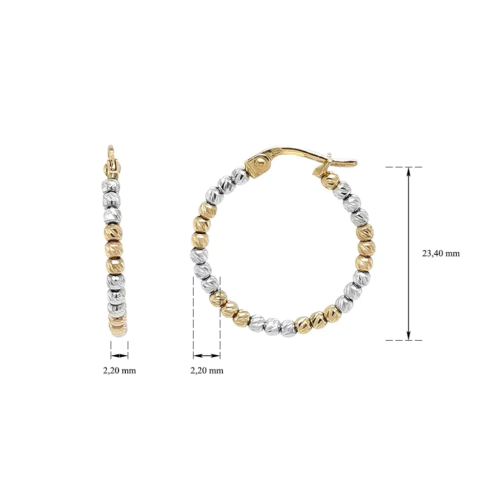 Золотые кольцевые серьги из комбинированного золота с бусинным узором