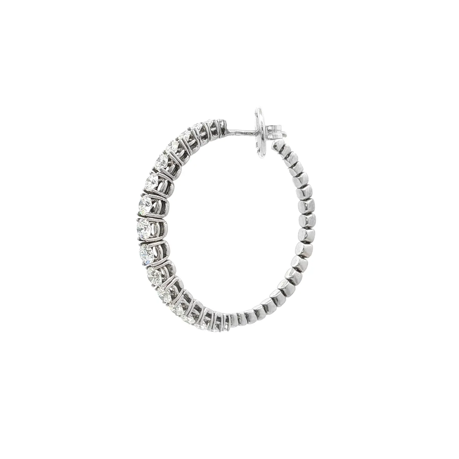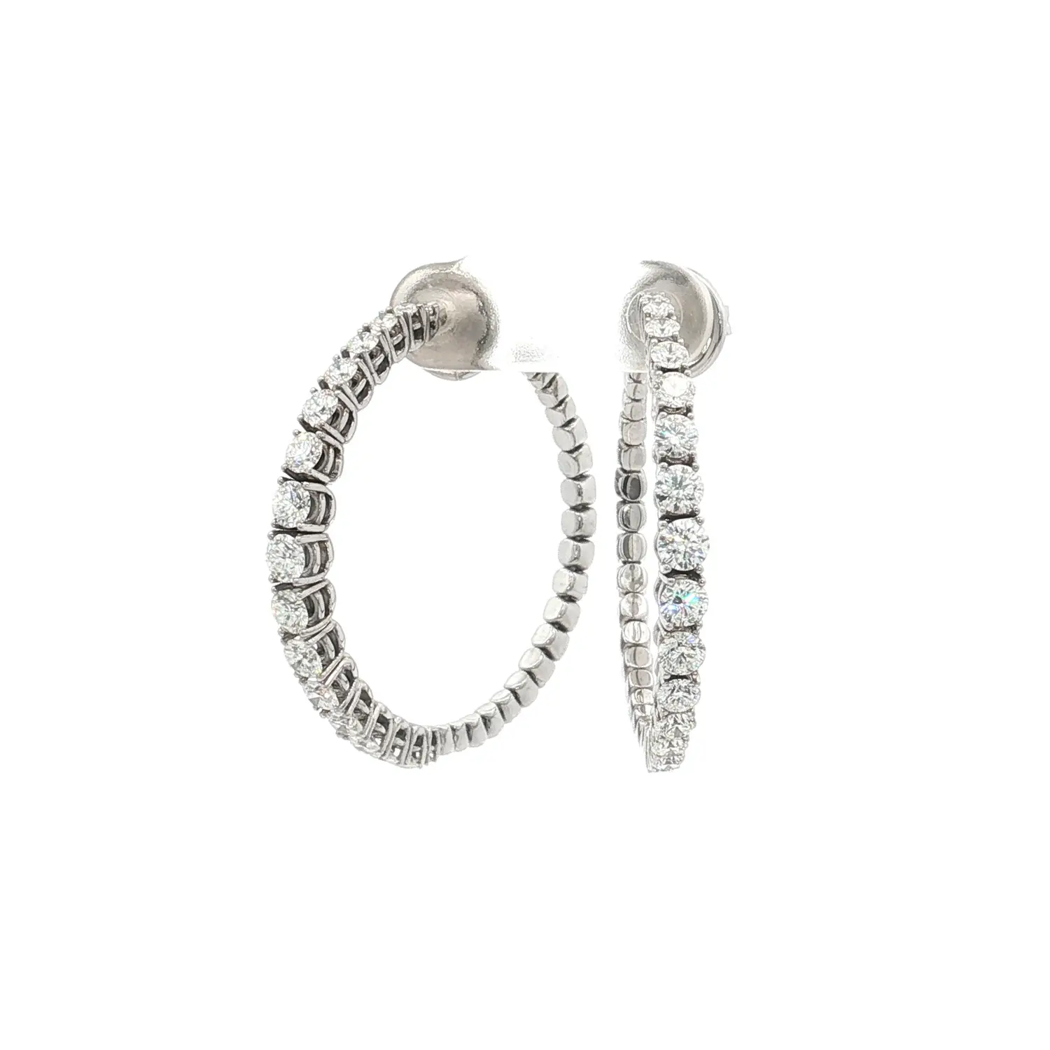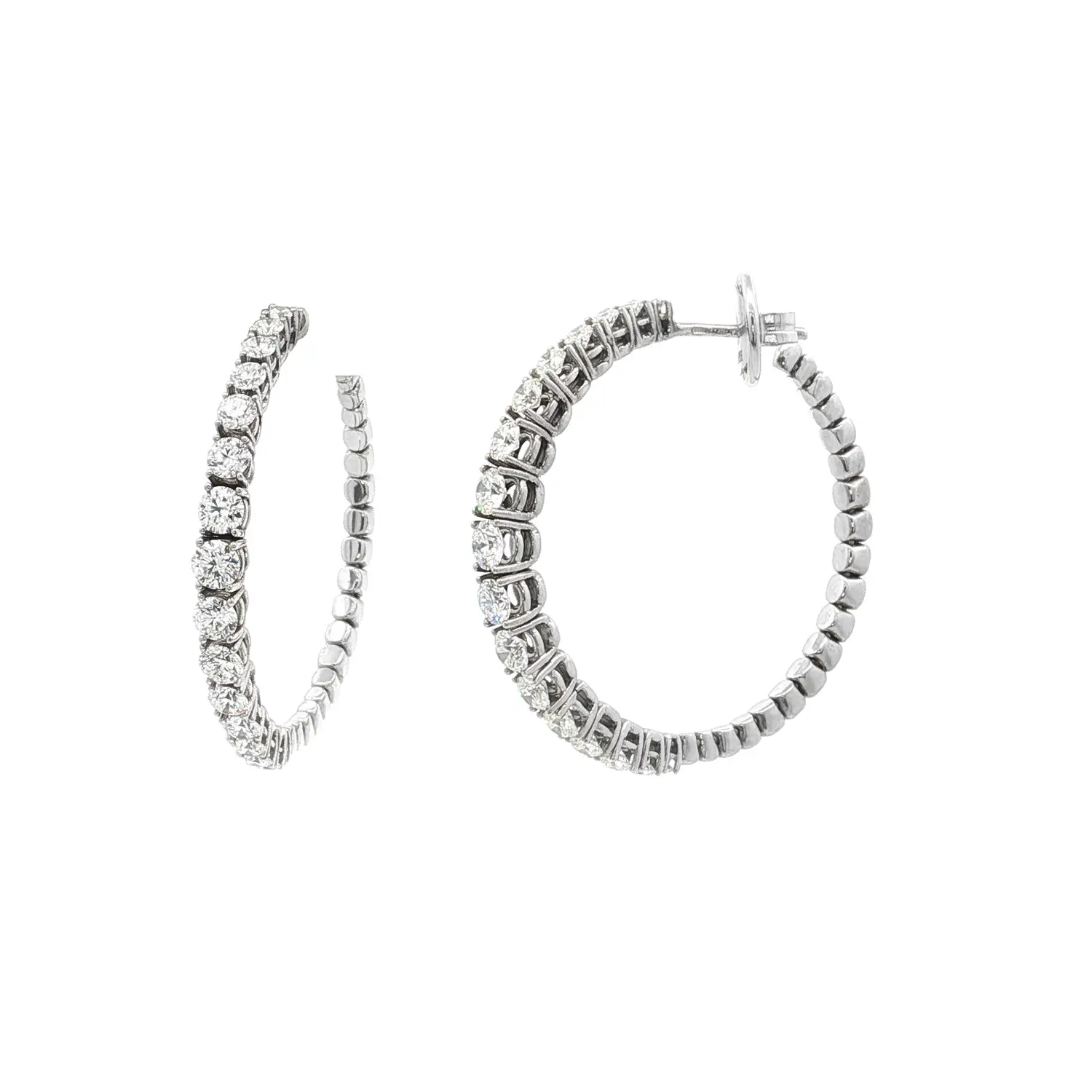 Эти изысканные кольцевые серьги из белого золота — воплощение вечной элегантности и утончённого блеска. Каждое украшение инкрустировано рядом бриллиантов круглой огранки, которые равномерно окружают кольцо, отражая свет во множестве граней. Их совершенная форма символизирует гармонию, женственность и роскошь без излишеств.