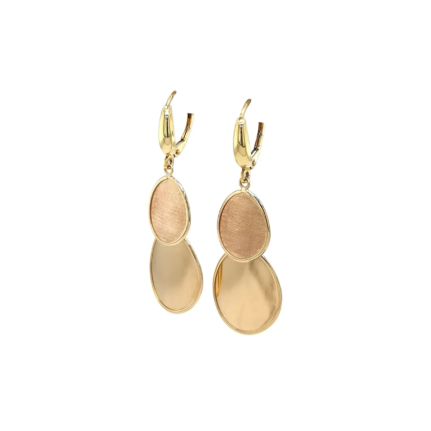 Эти золотые подвесные серьги привлекают внимание изысканным сочетанием двух овальных элементов с разной обработкой поверхности — верхний матовый и нижний зеркально полированный. Контраст текстур создаёт современный и гармоничный образ, а тёплое сияние жёлтого золота раскрывается при каждом движении.
