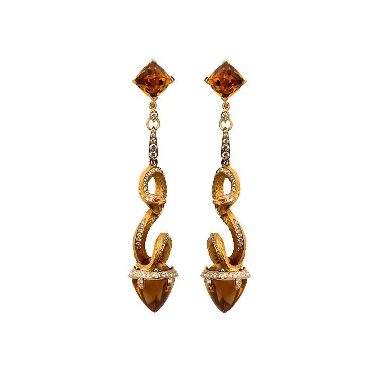 Эти серьги — это выразительное украшение, объединяющее змеиный мотив мифа, контраст металлов и камней, и ювелирное мастерство, создавая аксессуар, который излучает присутствие, историю и визуальное воздействие.