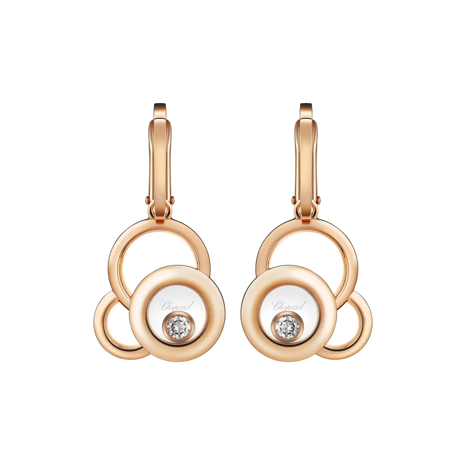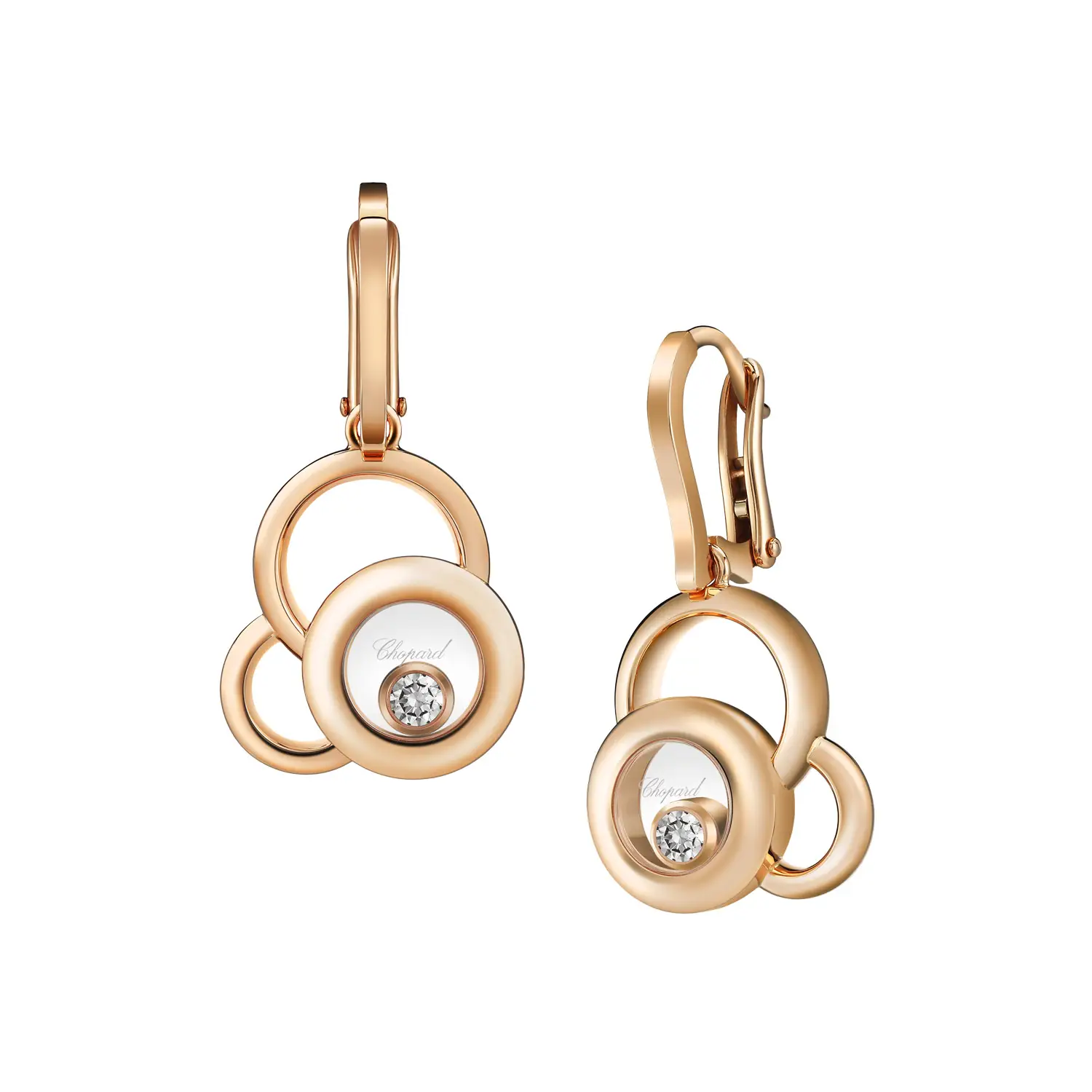 Серьги Chopard Happy Diamonds 839769-5001 воплощают радость, свет и вечную элегантность. Изготовлены из 18-каратного розового золота, украшены двумя свободно движущимися бриллиантами общим весом около 0,19 ct, которые изящно вращаются между двумя сапфировыми стёклами — фирменный элемент коллекции Happy Diamonds.