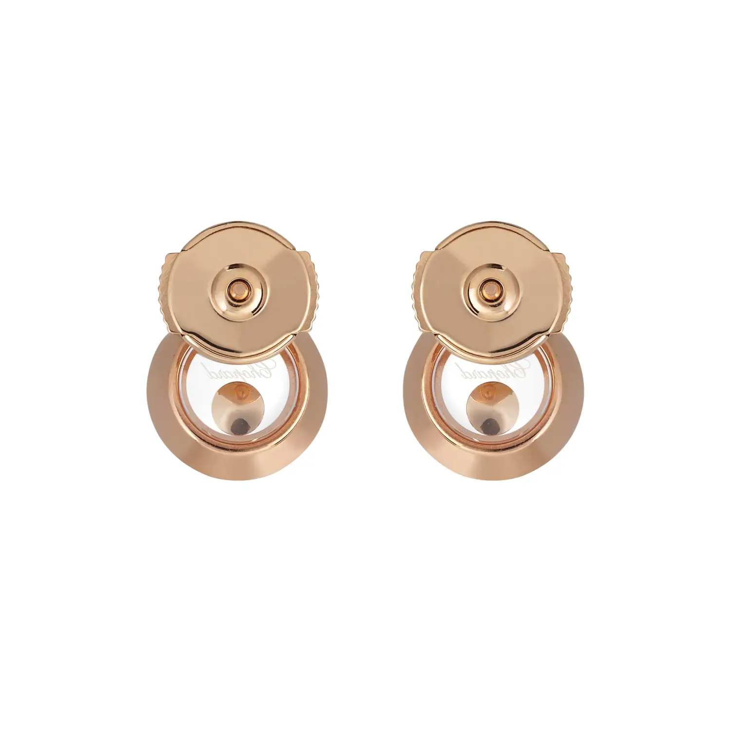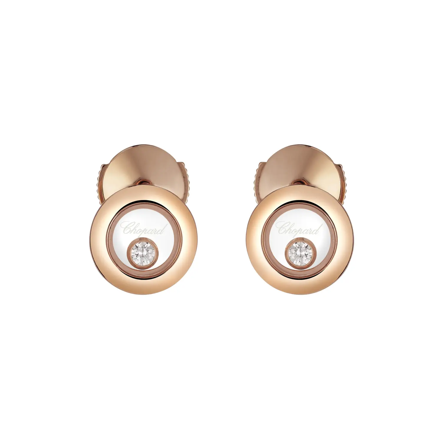 Chopard Happy Diamonds 83A017-5001 — элегантные серьги-пусеты, сочетающие игривость культовой коллекции с вне́временной женственностью. Выполнены из розового золота 18 карат (750/1000) с полированной поверхностью; чистые линии универсальны и легко сочетаются с другими украшениями Chopard. Для комфортного и надёжного ношения предусмотрена застёжка-пусета (butterfly) — на каждый день и для торжественных случаев.