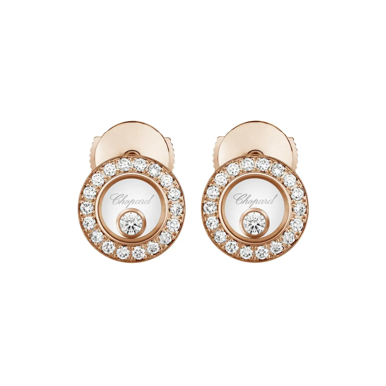 Серьги Chopard Happy Diamonds Icons 83A017-5201 воплощают гармонию света, движения и женственной элегантности. Изготовлены из 18-каратного розового золота, украшены свободно движущимися бриллиантами общим весом около 0,38 ct, которые изящно вращаются между двумя сапфировыми стёклами — фирменный элемент коллекции Happy Diamonds, символ радости и свободы.