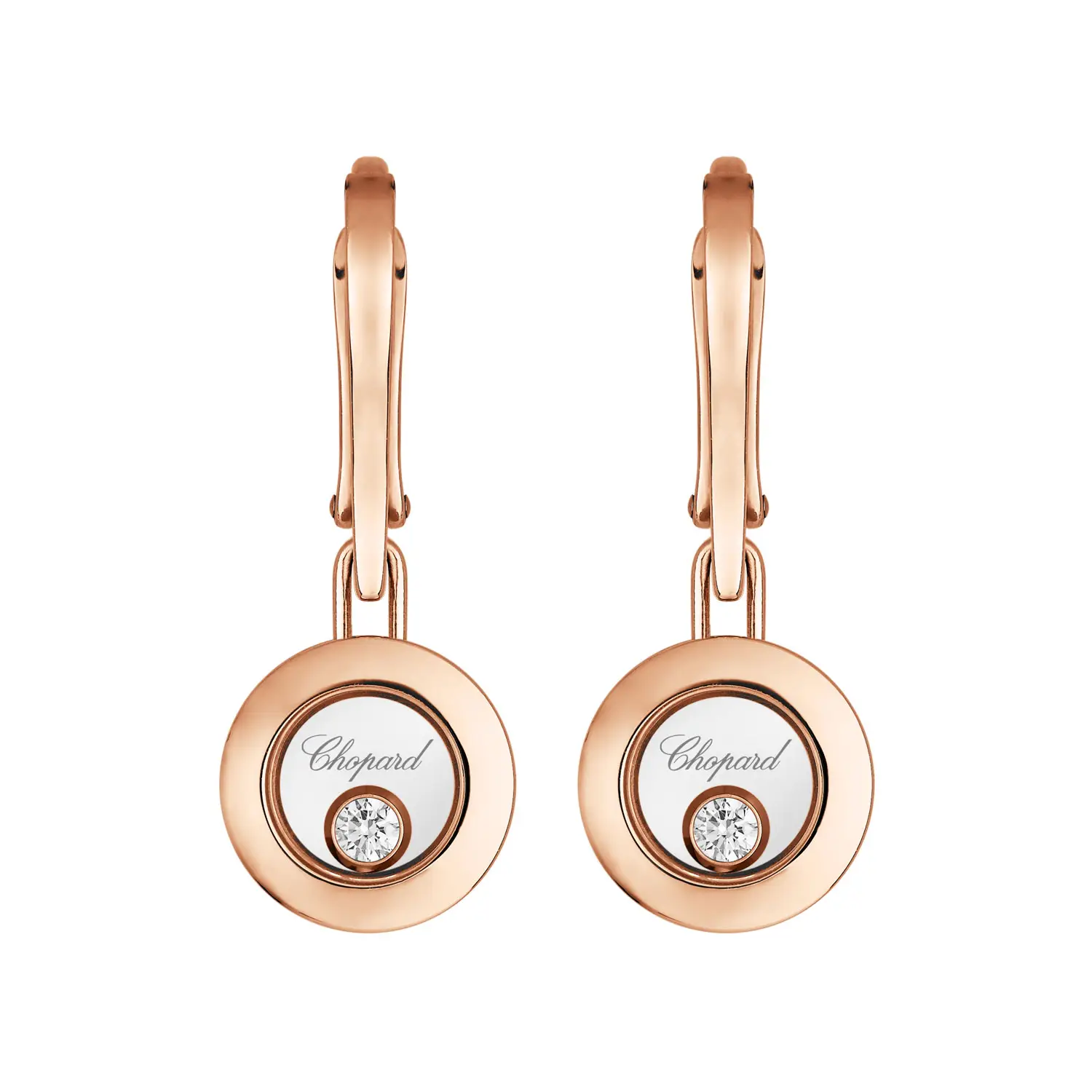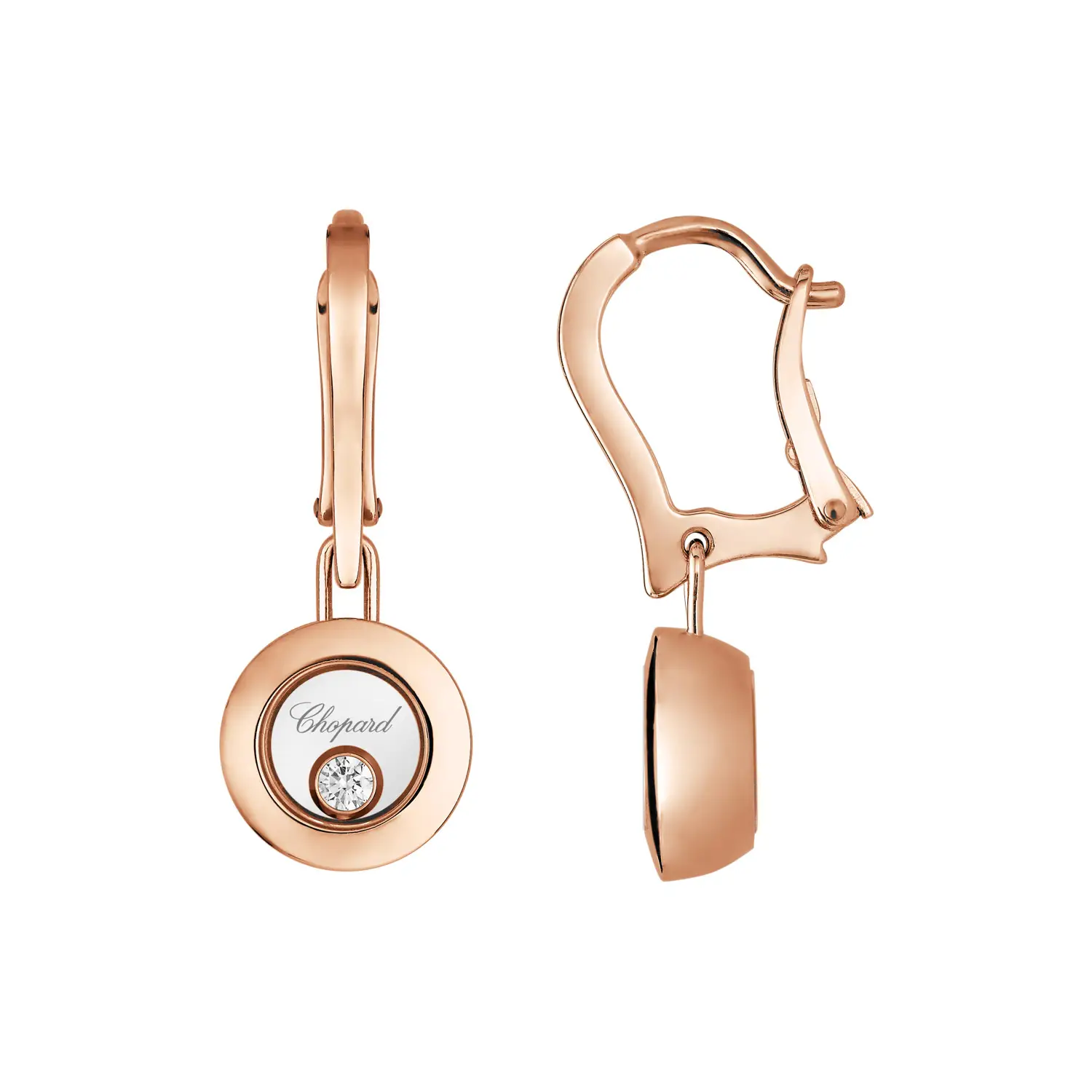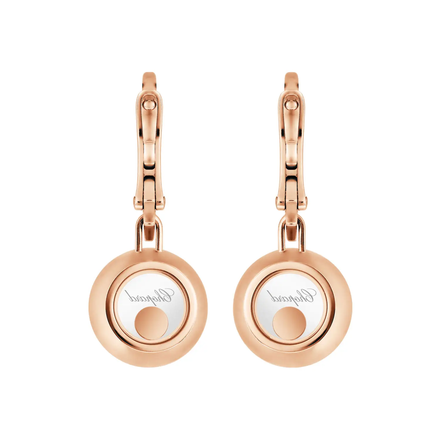 Серьги Chopard Happy Diamonds Icons 83A017-5301 воплощают идеальную гармонию движения, света и элегантности. Изготовлены из 18-каратного розового золота, украшены бриллиантами общим весом около 0,10 ct, которые свободно двигаются между двумя сапфировыми стёклами — фирменный элемент коллекции Happy Diamonds, символ радости, свободы и женственности.