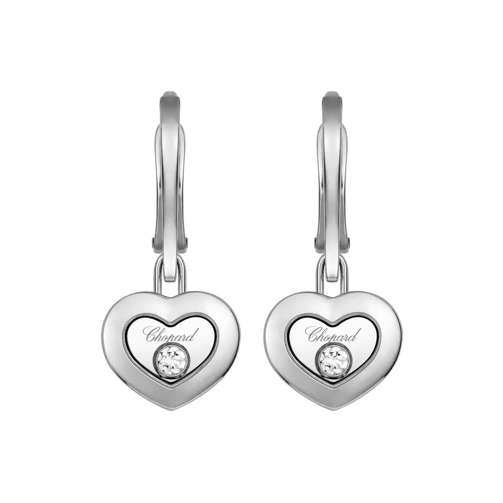 Chopard Happy Diamonds 83A054-1301 — элегантные висячие серьги, в которых игривость культовой коллекции сочетается с вне́временной утончённостью. Выполнены из белого золота 18 карат (750/1000) с полированной поверхностью и фирменным сердечным мотивом; женственные, нежные и совремённые. Универсальный дизайн легко сочетается с другими украшениями Chopard — для повседневных образов и торжественных случаев.