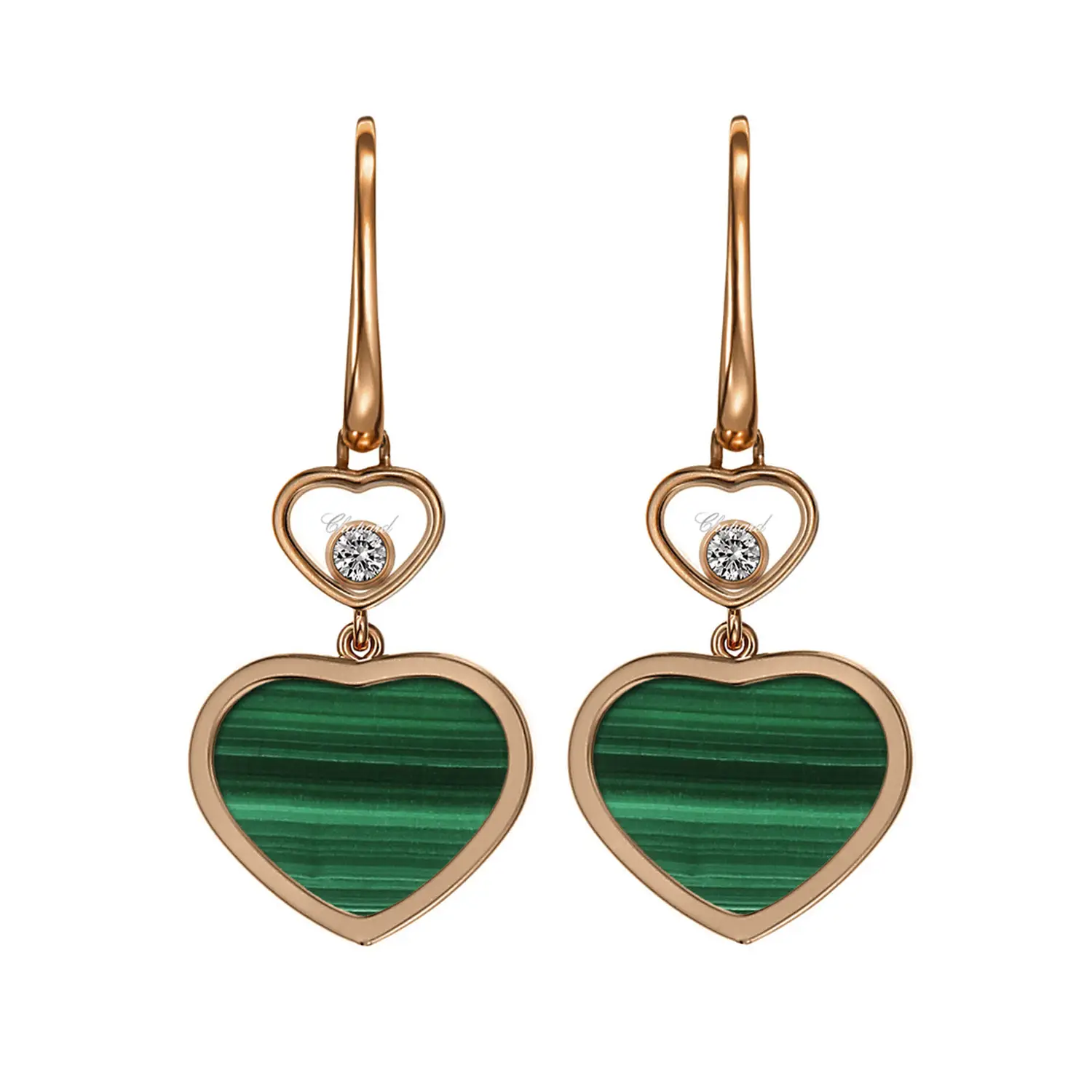 Серьги Chopard Happy Hearts 837482-5111 воплощают гармонию женственности и утончённого шика. Изготовлены из этичного розового золота 18 карат, украшены сердцами из зелёного малахита и бриллиантами общим весом 0,10 карата, заключёнными в миниатюрные золотые сердца. Каждый их поворот создаёт игру света и блеска.