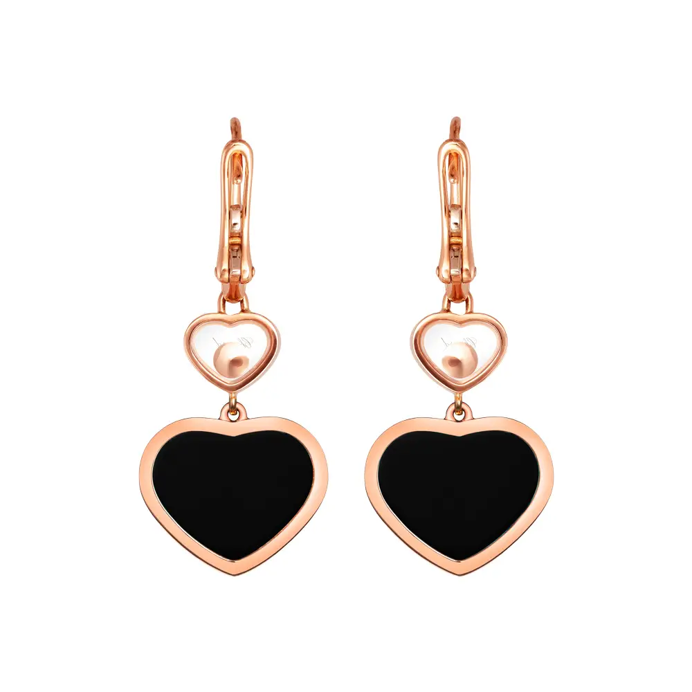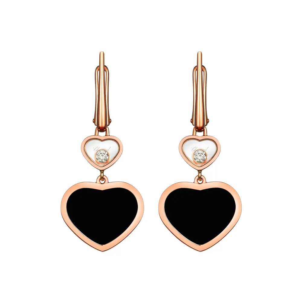 Chopard Happy Hearts 837482-5210 — висячие серьги, в которых игривый сердечный мотив сочетается с вне́временной элегантностью. Выполнены из розового золота 18 карат (750/1000) с полированной поверхностью; выразительный характер привлекает внимание при каждом движении и подходит как к торжественным, так и к повседневным образам. Надёжную и комфортную посадку обеспечивает французская застёжка (бризура), подчёркивающая роскошное исполнение.