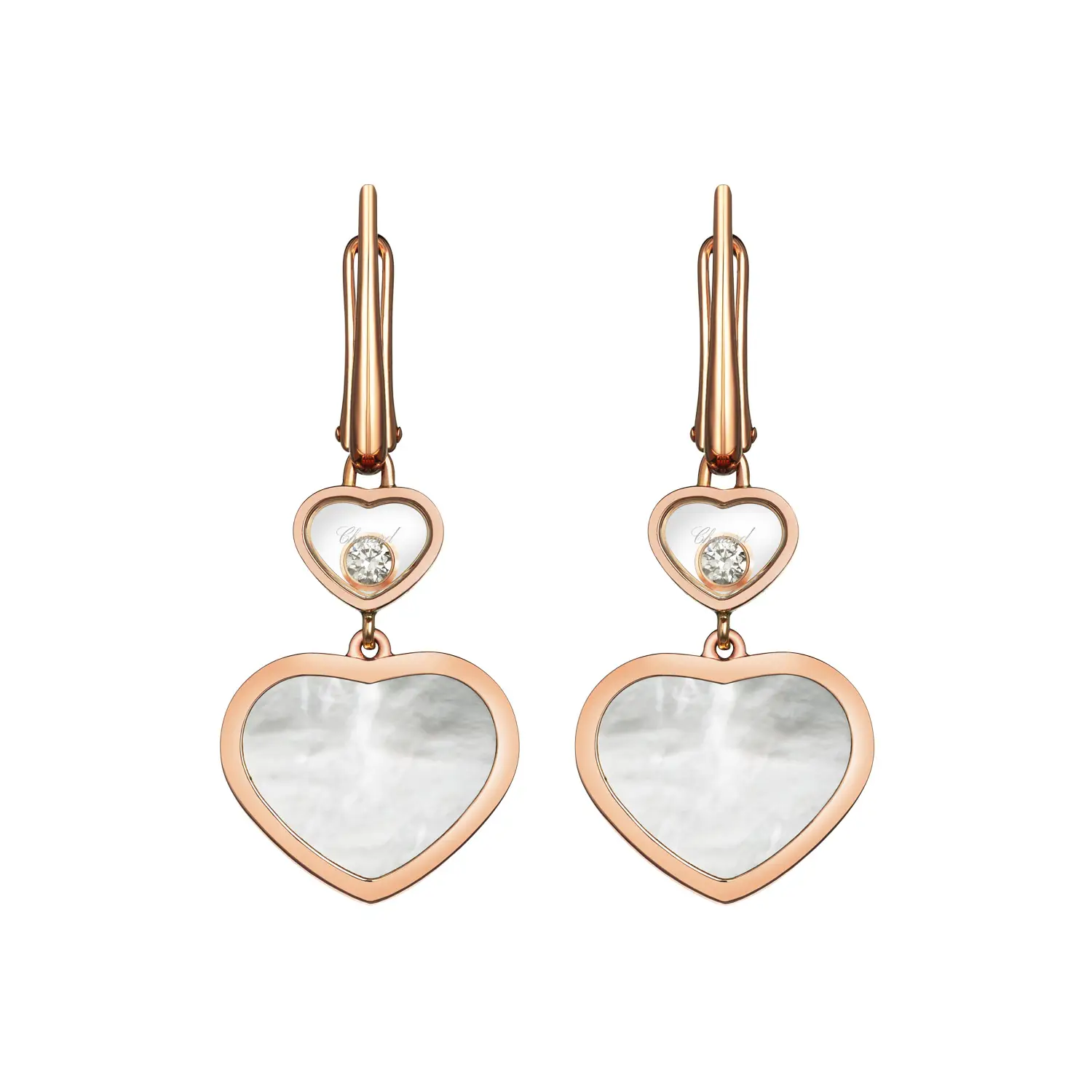 В центре композиции — природный перламутр (2 шт.) в форме сердца / Heart, нежно-белого оттенка (происхождение: природный), придающий мягкое, светящееся сияние. Искры добавляют природные бриллианты 0,10 ct (2 шт.), круглой огранки / Round, белого цвета, с чистотой IF–VVS и цветом F–G. В результате получаются серьги вне́временные, женственные и выразительные, которые легко сочетаются с другими изделиями Chopard и украшают как торжественные, так и повседневные образы.