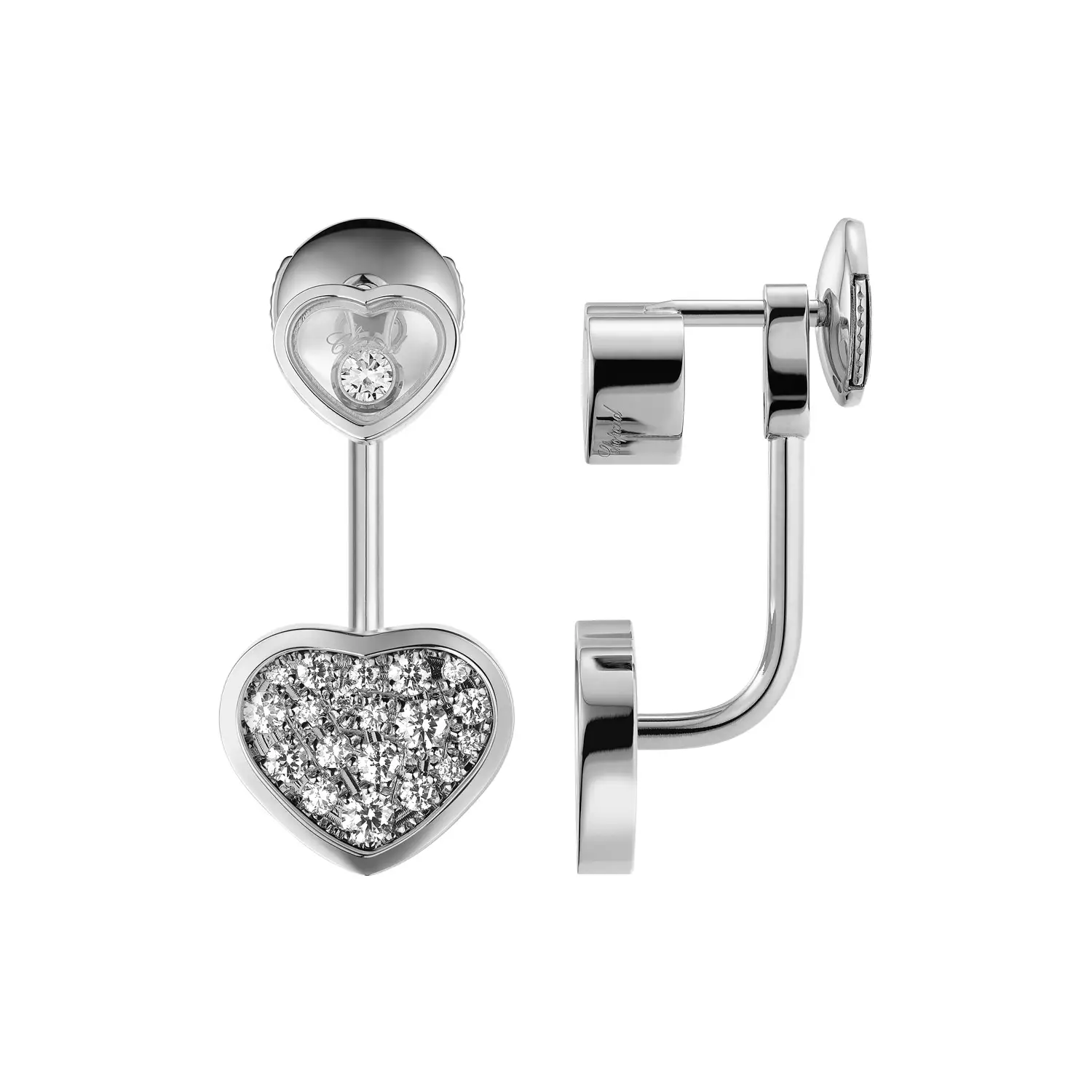 Серьги Chopard Happy Hearts 83A082-1009 воплощают фирменную элегантность Chopard в её чистейшем виде. Изготовлены из 18-каратного белого золота, украшены бриллиантами общим весом около 0,44 ct, помещёнными в сердечные мотивы — символ любви, радости и счастья, характерный для коллекции Happy Hearts.