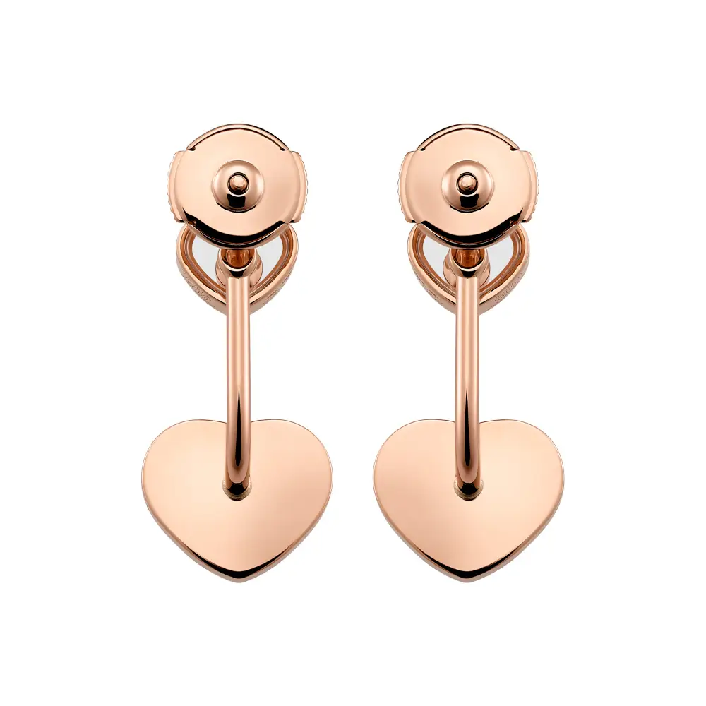 Chopard Happy Hearts 83A082-5801 — короткие висячие серьги, в которых игривый сердечный мотив сочетается с мягкой женственностью. Изготовлены из розового золота 18 карат (750/1000) с полированной поверхностью; стиль с крупной вставкой привлекает внимание при каждом движении. Для комфортного и надёжного ношения предусмотрен штифт с застёжкой-пусетой (butterfly) — подойдут и для повседневных образов, и для торжественных случаев.