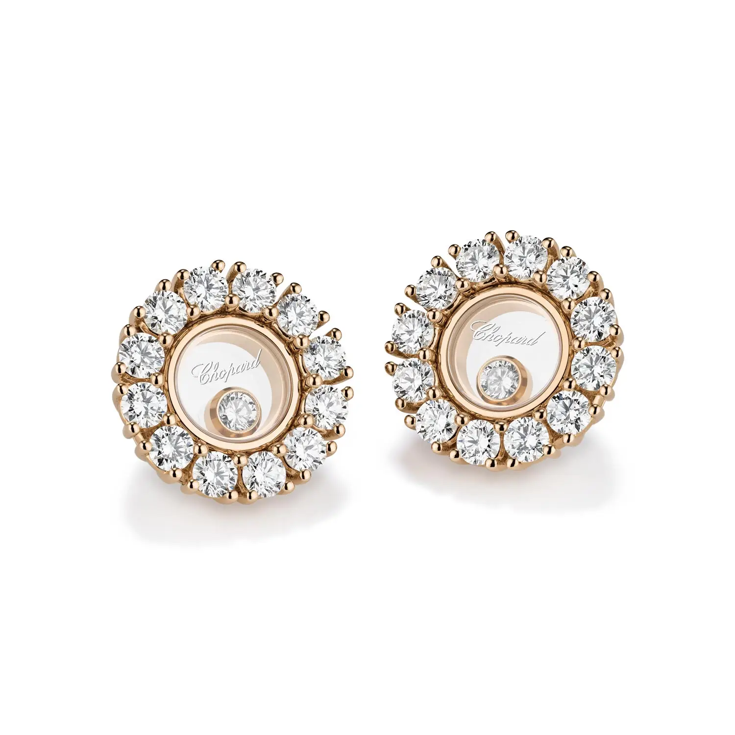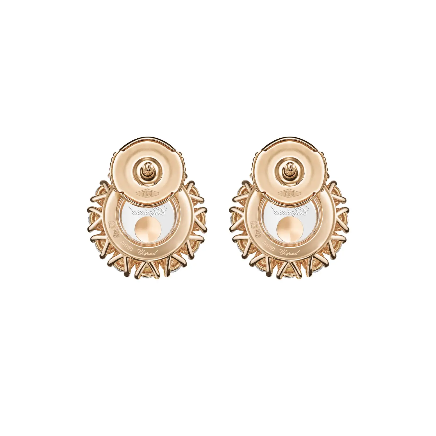 Серьги Chopard Happy Diamonds 83A609-5001 воплощают элегантность, движение и свет – три ключевых элемента коллекции Happy Diamonds. Изготовлены из этичного розового золота 18 карат, украшены подвижными бриллиантами, свободно танцующими между двумя сапфировыми стёклами. Общий вес бриллиантов — около 1,20 карата.