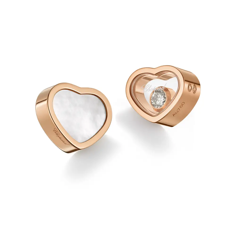 Серьга выполнена из этического розового золота 18 карат и украшена сердечком с плавающим бриллиантом (0,05 карата), который мерцает при каждом движении. Модель представлена как одиночная серьга (single earring) — её можно носить отдельно или сочетать с другими украшениями из коллекции My Happy Hearts.