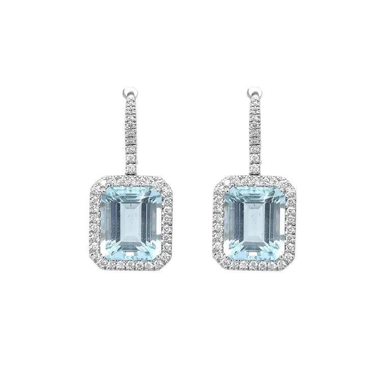 Доминируют природные аквамарины 11,10 кт (2 шт.) в изумрудной огранке (12,00 × 10,00 мм), чистого голубого оттенка. Блеск и объём усиливает паве из природных бриллиантов 0,88 кт (72 шт.) круглой огранки, Ø 1,35 мм, белые, чистота SI, цвет G. Точная закрепка и контраст светло-голубых аквамаринов с бриллиантовым сиянием создают роскошные, выразительные и вне-временные серьги, мгновенно притягивающие взгляд.