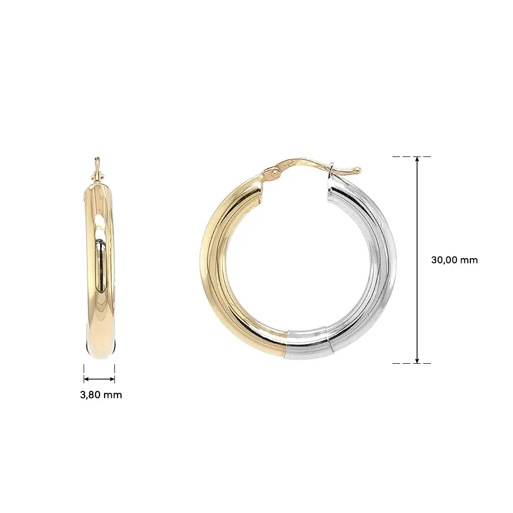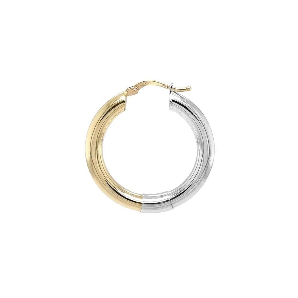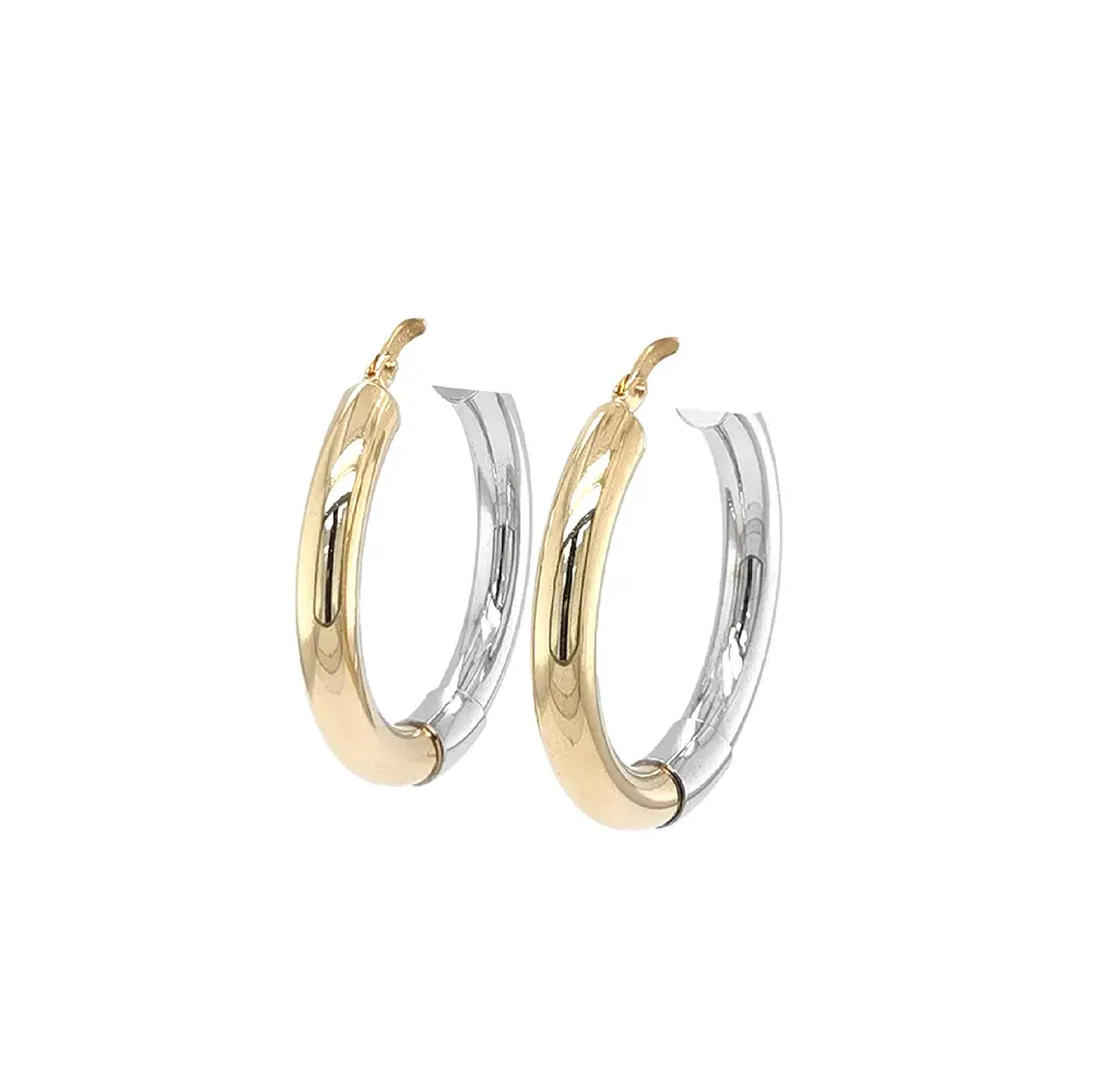 Золотые серьги-кольца из комбинированного золота привлекают чистыми линиями и элегантным сочетанием жёлтого и белого золота. Гладкая, зеркально полированная поверхность подчёркивает роскошный характер и высокое качество исполнения.