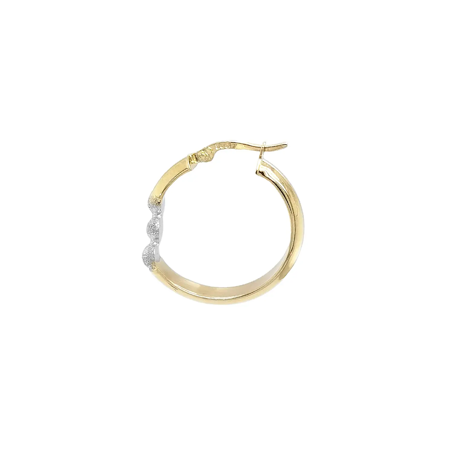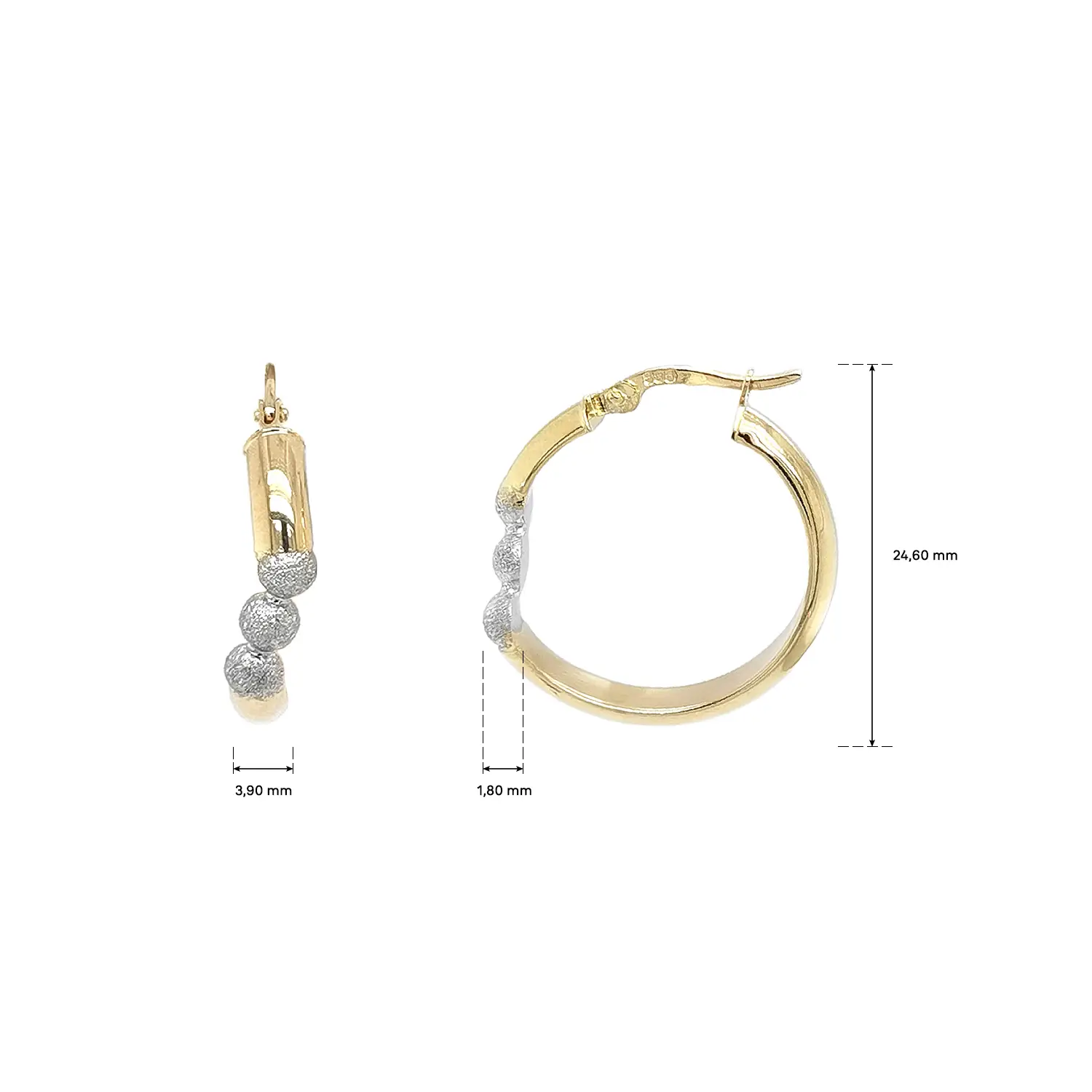 Эти элегантные серьги-кольца из жёлтого золота сочетают полированную поверхность с декоративными матовыми полусферами из белого золота, создавая современный и женственный контраст. Диаметр 24,60 мм делает серьги универсальными — для повседневного ношения и торжеств.