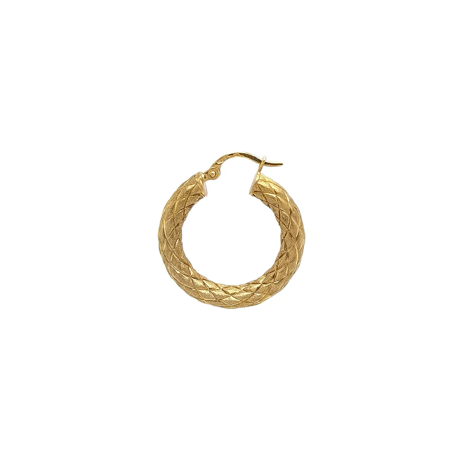 Эти выразительные серьги-кольца из 14-каратного жёлтого золота привлекают внимание уникальной поверхностью с плетёной текстурой. Матовая рельефная отделка создаёт богатый, детализированный эффект, мягко отражая свет и придавая украшению роскошный и слегка винтажный характер. Более массивный профиль делает серьги элегантными и одновременно оригинальными — идеальный выбор для тех, кто ценит выразительный и тонко проработанный дизайн.