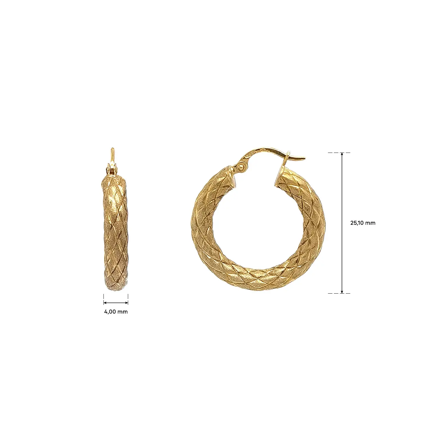С диаметром 25,10 мм серьги предлагают идеальный средний размер — заметные, но удобные для повседневного ношения. Надёжный замок обеспечивает безопасность и комфорт. Прекрасный вариант для любительниц золотых колец, желающих иметь текстурное, декоративное и элегантное украшение.