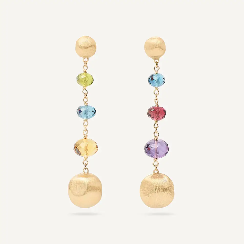Серьги Marco Bicego Africa OB1625 MIX02 Y представляют собой изысканное сочетание цвета, элегантного дизайна и ювелирного мастерства. Они выполнены из жёлтого золота 18 kt (750/1000) с матовой отделкой, подчёркивающей богатство цветных камней. Крепление — пуссета (штифт) — обеспечивает удобство и незаметность при ношении.