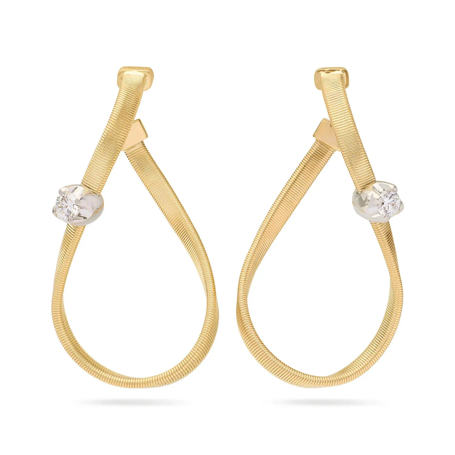 Роскошные золотые серьги Marco Bicego Marrakech OG404_B8 YW M5 изготовлены из 18-каратного жёлтого и белого золота (750/1000) и входят в культовую коллекцию Marrakech, вдохновлённую неровными линиями старинных улиц марокканского города Марракеш. Характерной особенностью является фирменная техника coil, при которой тонкая золотая нить вручную спирально наматывается вокруг золотой основы.