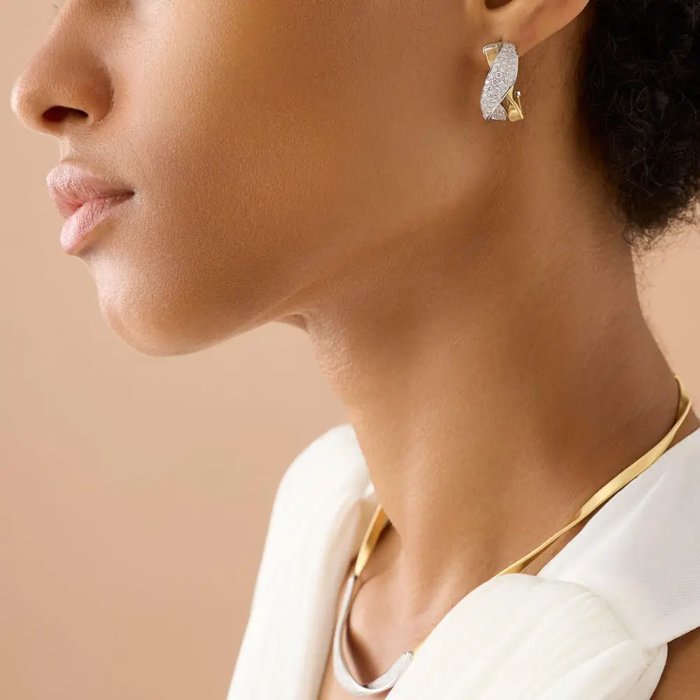 Важный акцент — бриллиантовое павé, где бриллианты круглой огранки закреплены вдоль скрученных золотых лент. Камни придают украшению блеск и изысканную нежность, сохраняя при этом гармоничный и сдержанный характер.